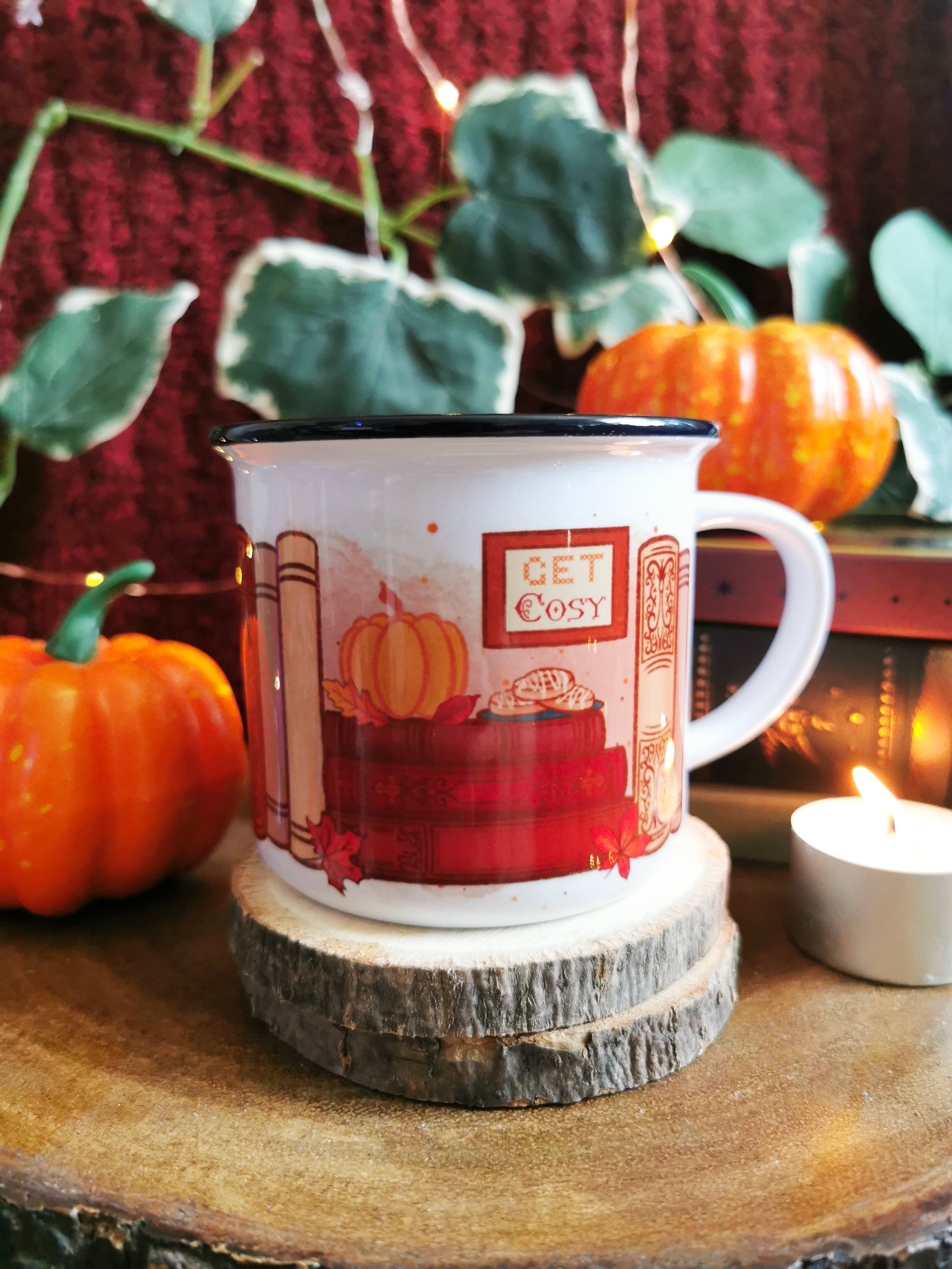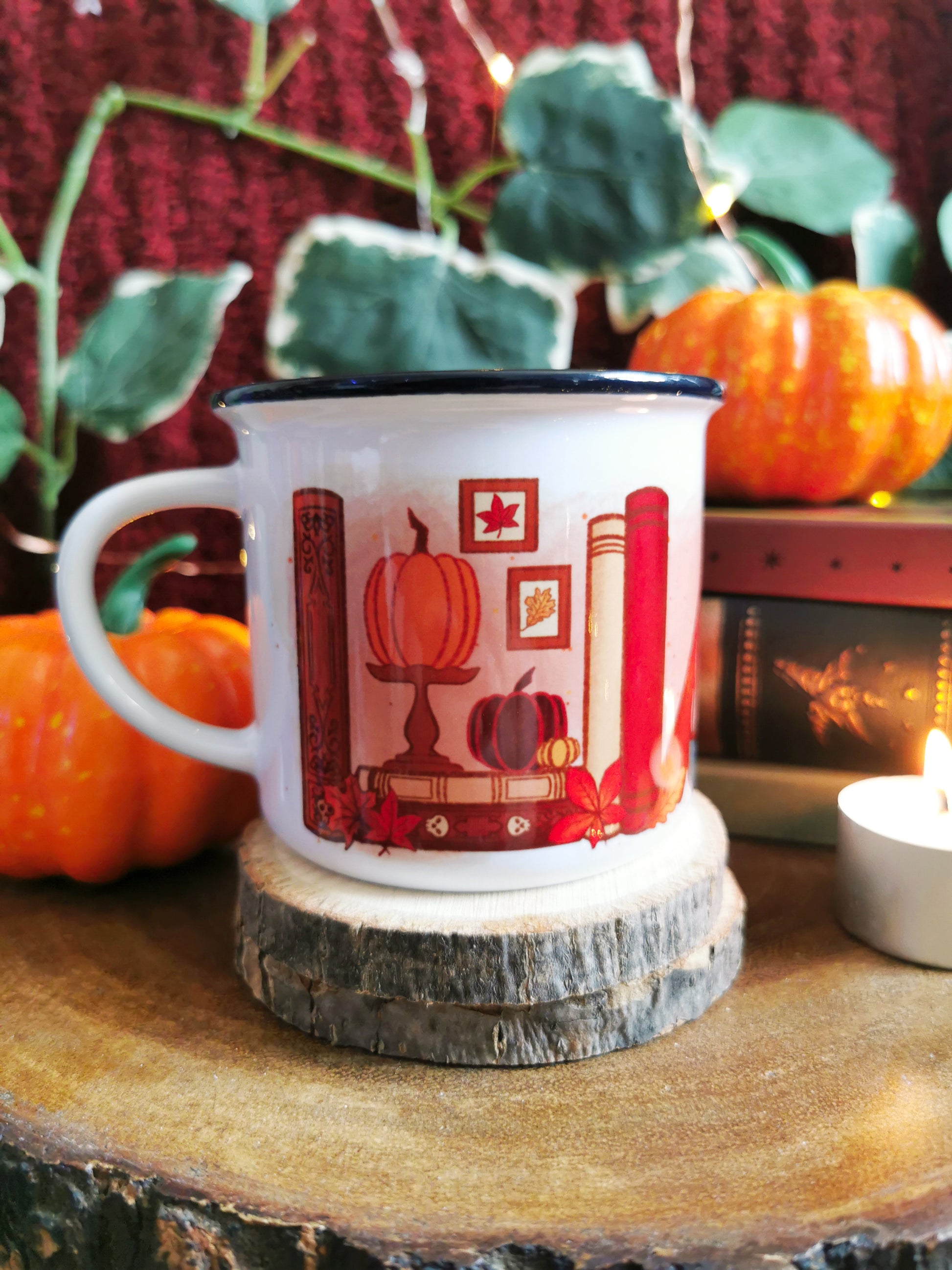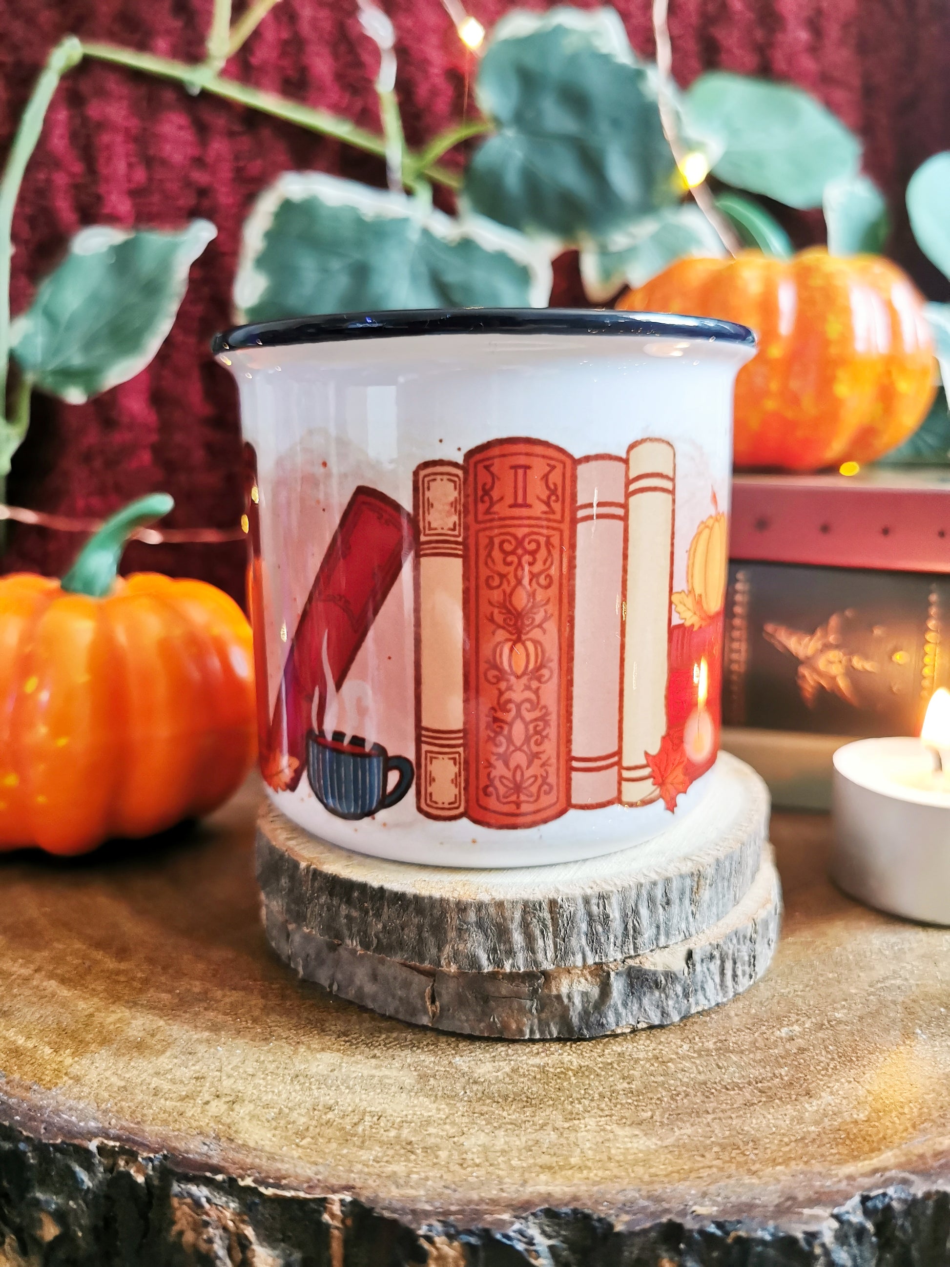 Original design is sublimated on the white ceramic camper mug in my little home studio in Chelmsford . Design features stacks of books in autumnal shades, pumpkins, fall leaves and cinnamon rolls.