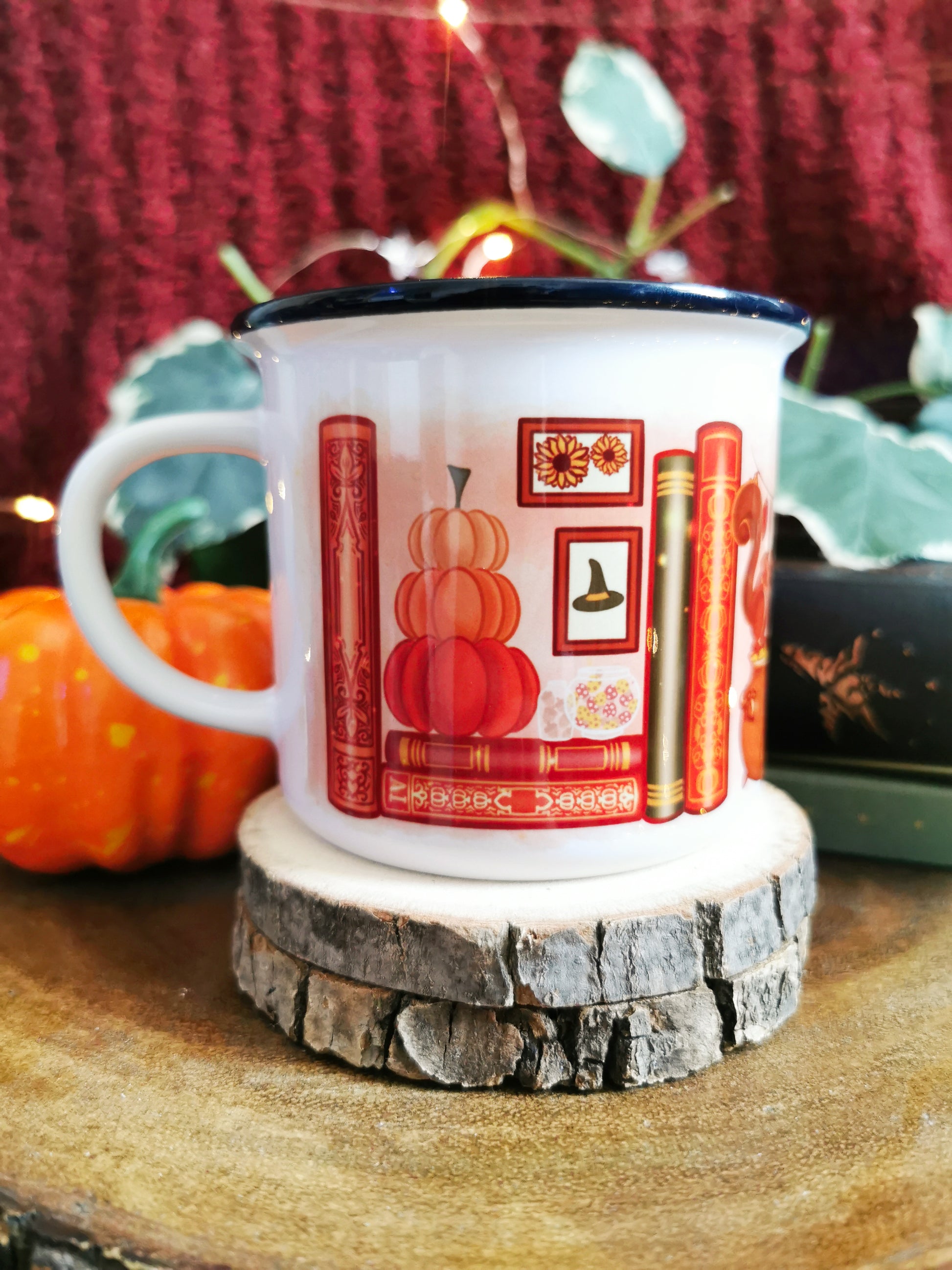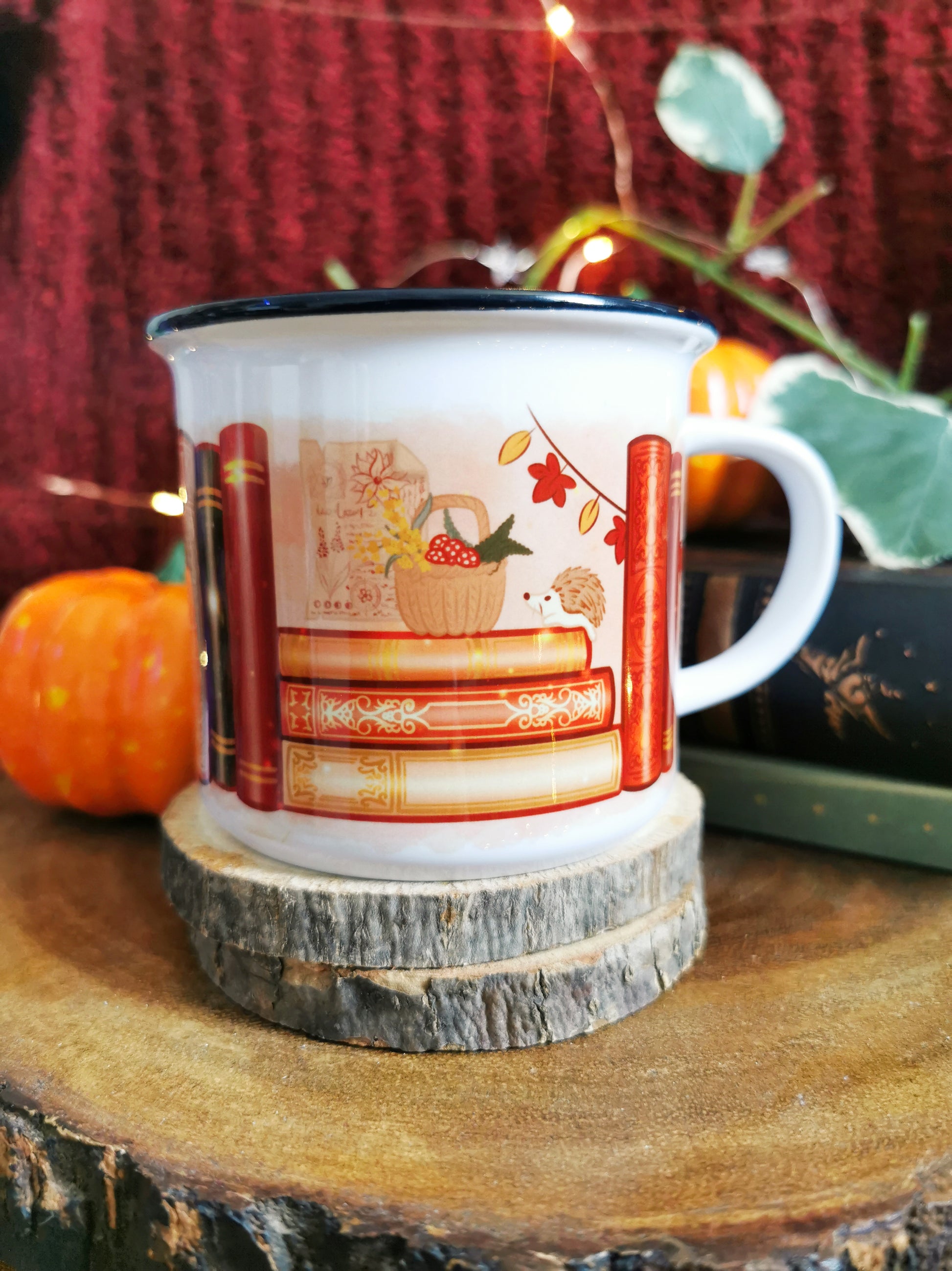 Original design is sublimated on the white ceramic camper mug in my little home studio in Chelmsford . Design features stacks of books in autumnal shades, fall leaves and woodland critters
