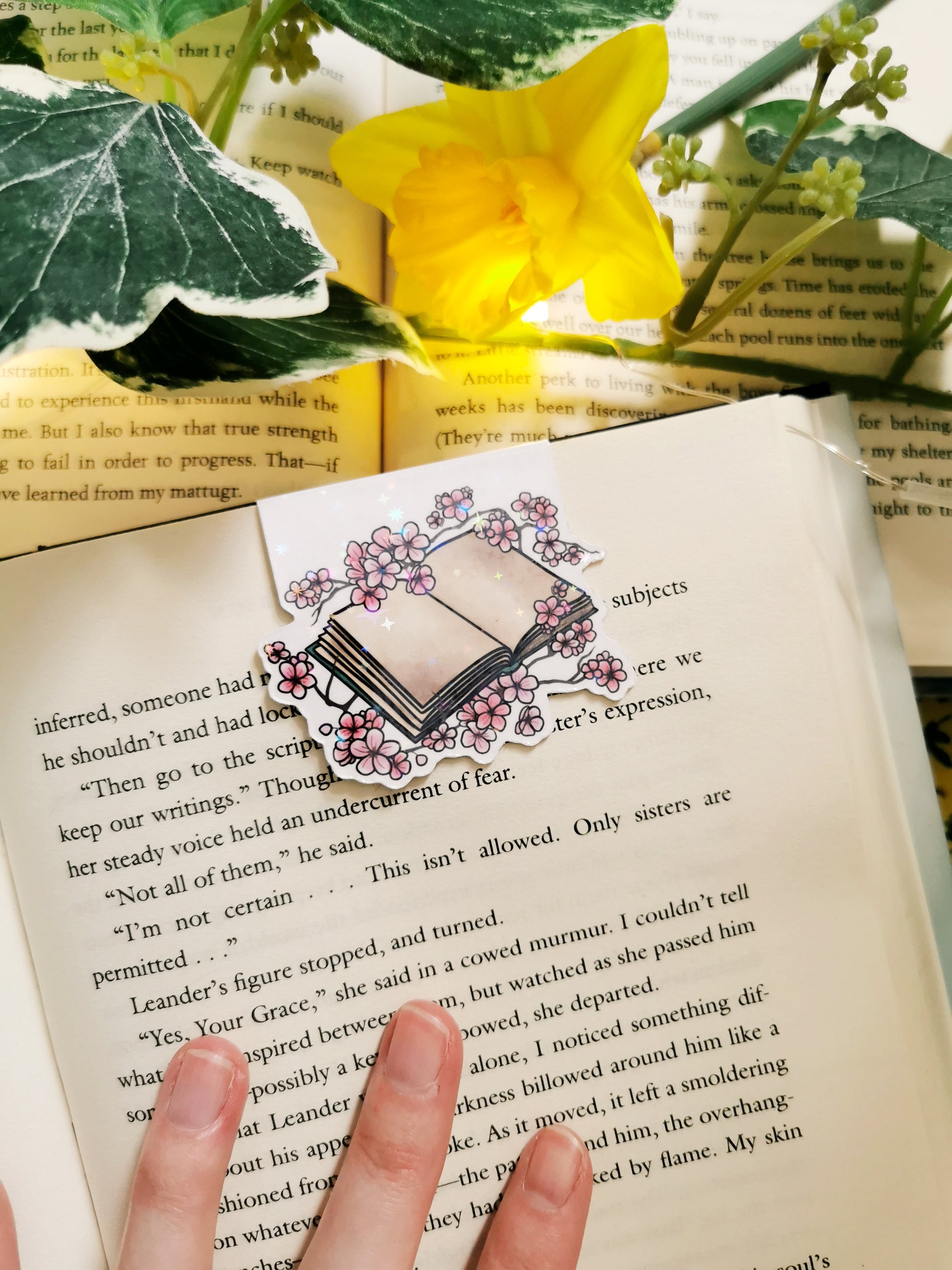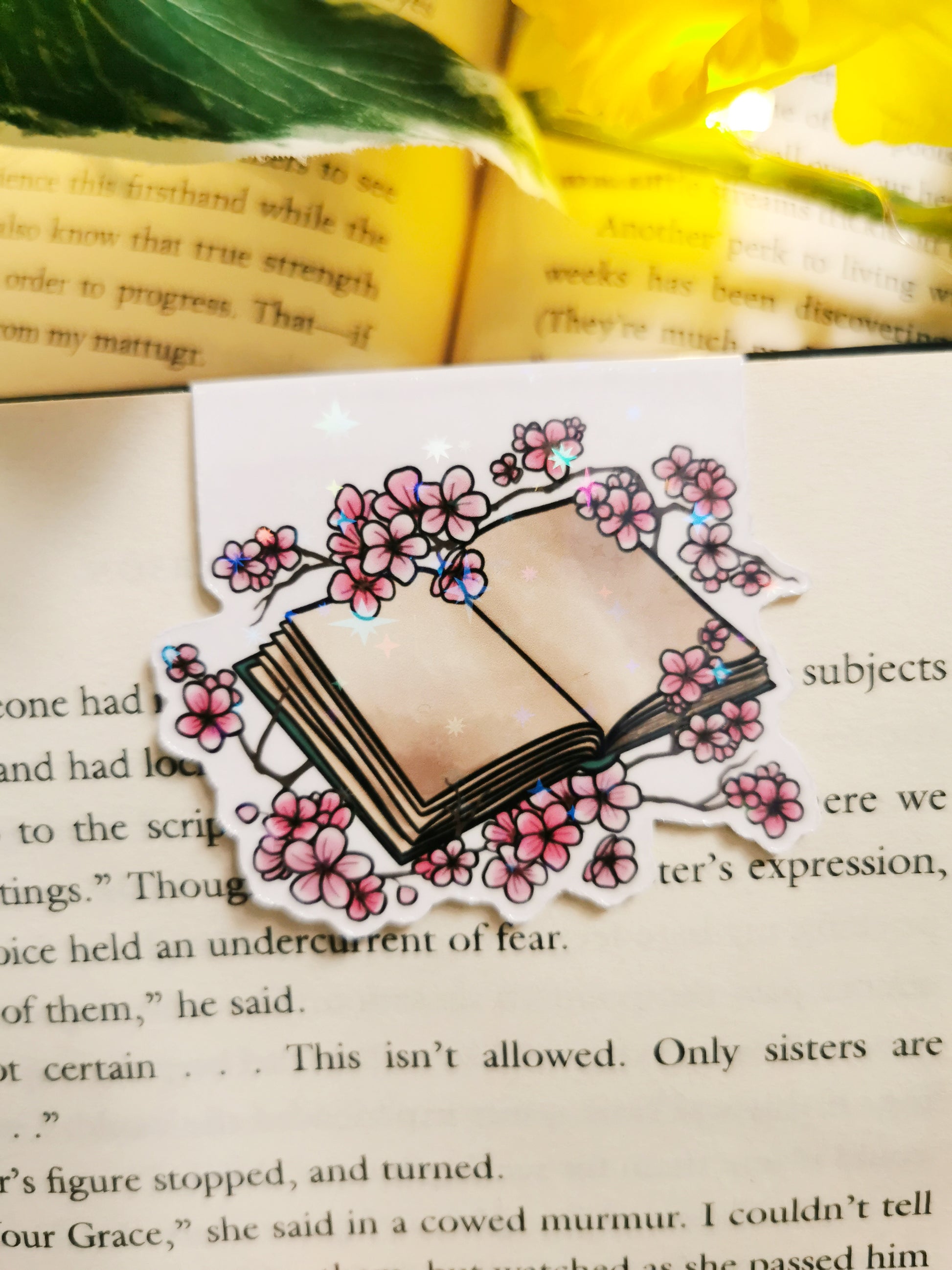 Mark your place in your book or planner with this cherry blossom & book holographic magnetic bookmark.