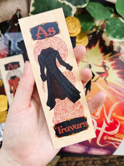 Double-sided woodmark featuring Kell’s peculiar coat. On one side the coat is Kell’s ruby red royal coat and on the reverse the coat transforms to Kell’s travelling black coat with elbow patches.