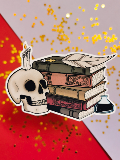 Dark Academia inspired sticker, featuring skull, quill, and book stack.