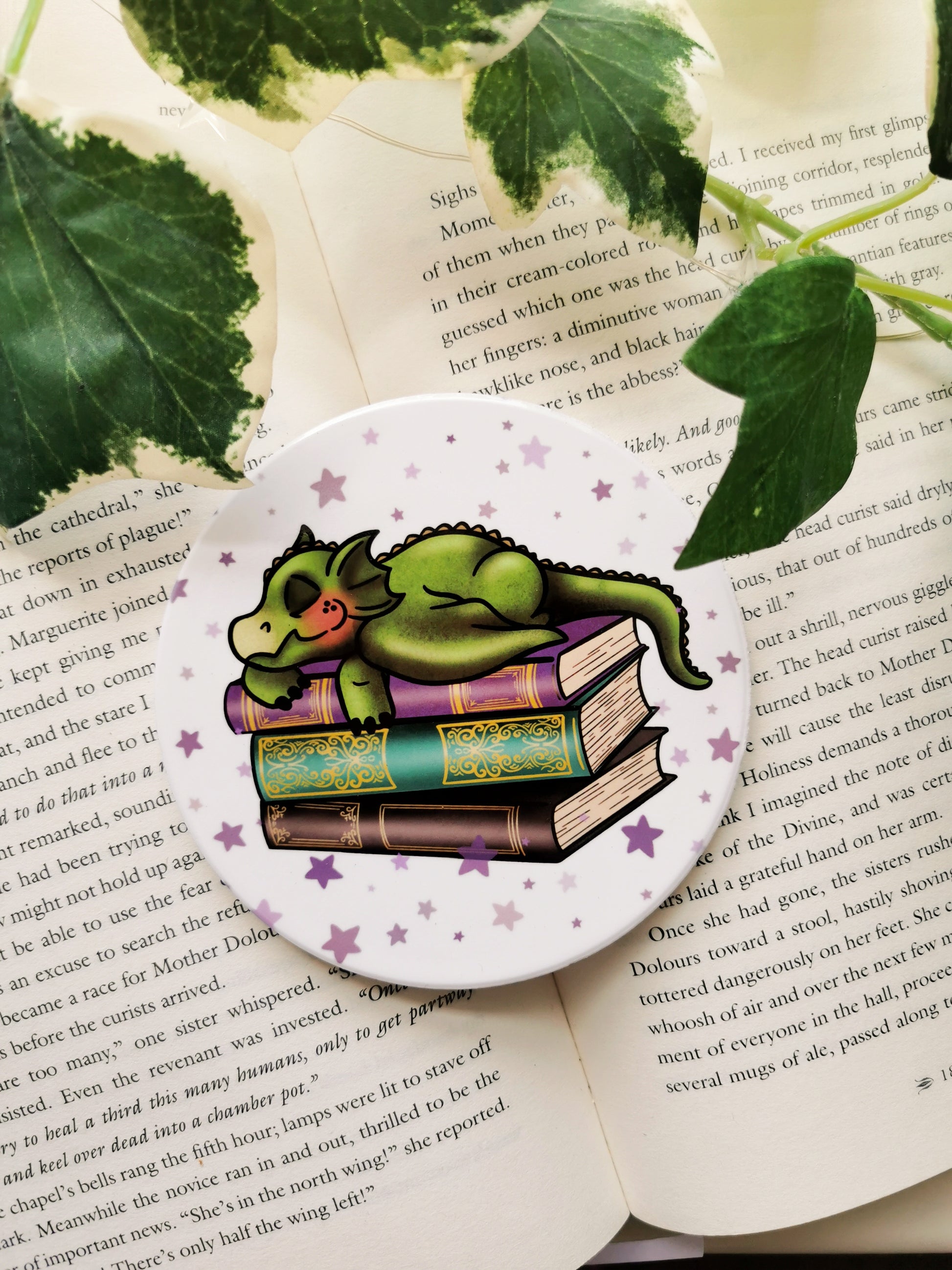The white coaster is 10.5cm diameter and features our original illustration of a sleepy dragon atop a stack of magical books.