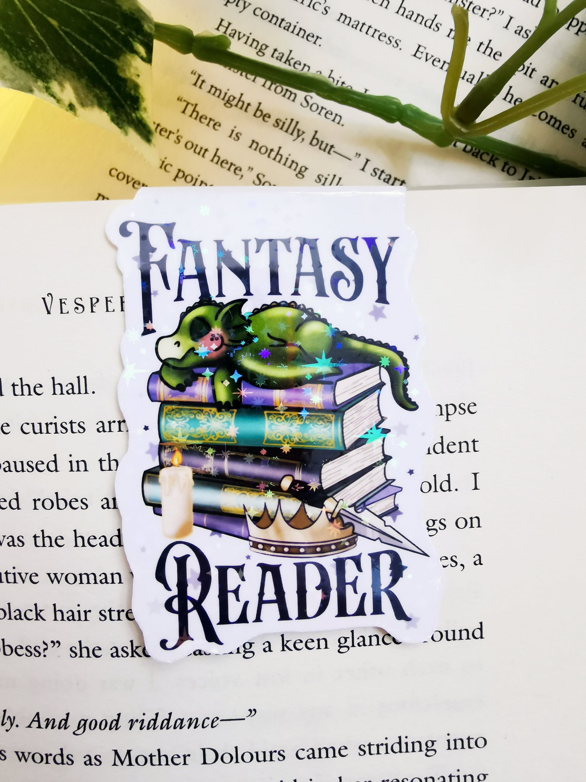 Mark your place in your fantasy read with this Fantasy Reader magnetic bookmark. The original illustration features a sleeping baby dragon atop a stack of books and framed by a golden crown, dagger and candle.