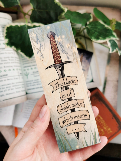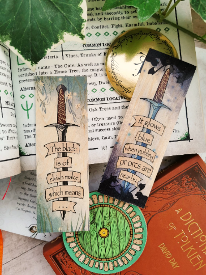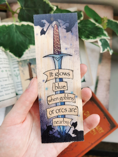 Double-sided woodmark featuring Bilbo/Frodo Baggin’s sword. One one side the sword is in it’s neutral state and on the reverse the swords glows blue as the shadows on orcs linger nearby.