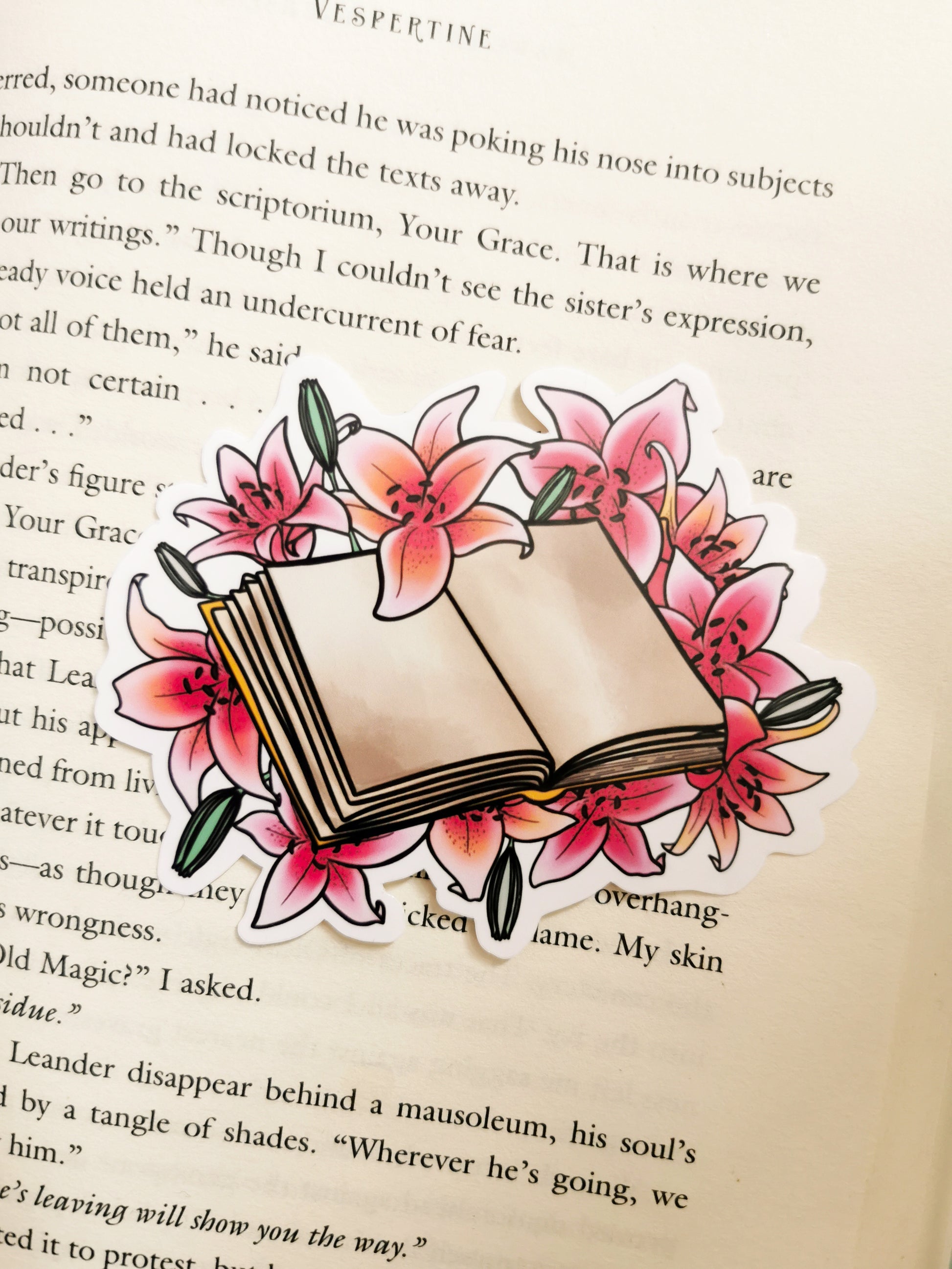 Cute book & lily vinyl sticker. The perfect bookish accessory to show your love of reading this summer. Stick on your laptop, water bottle, book cart…..literally anywhere you like, to add a touch of bookish beauty to your space.