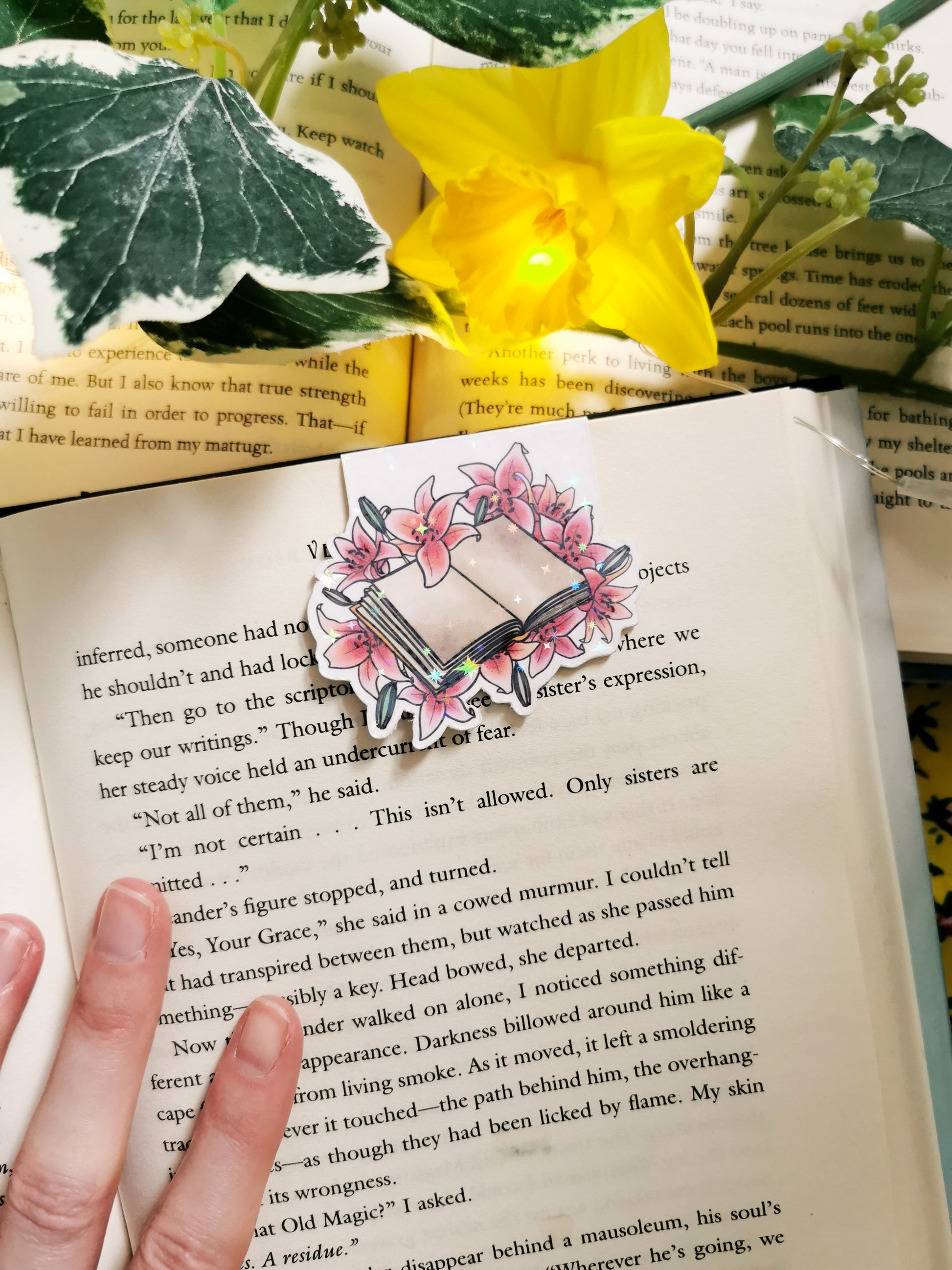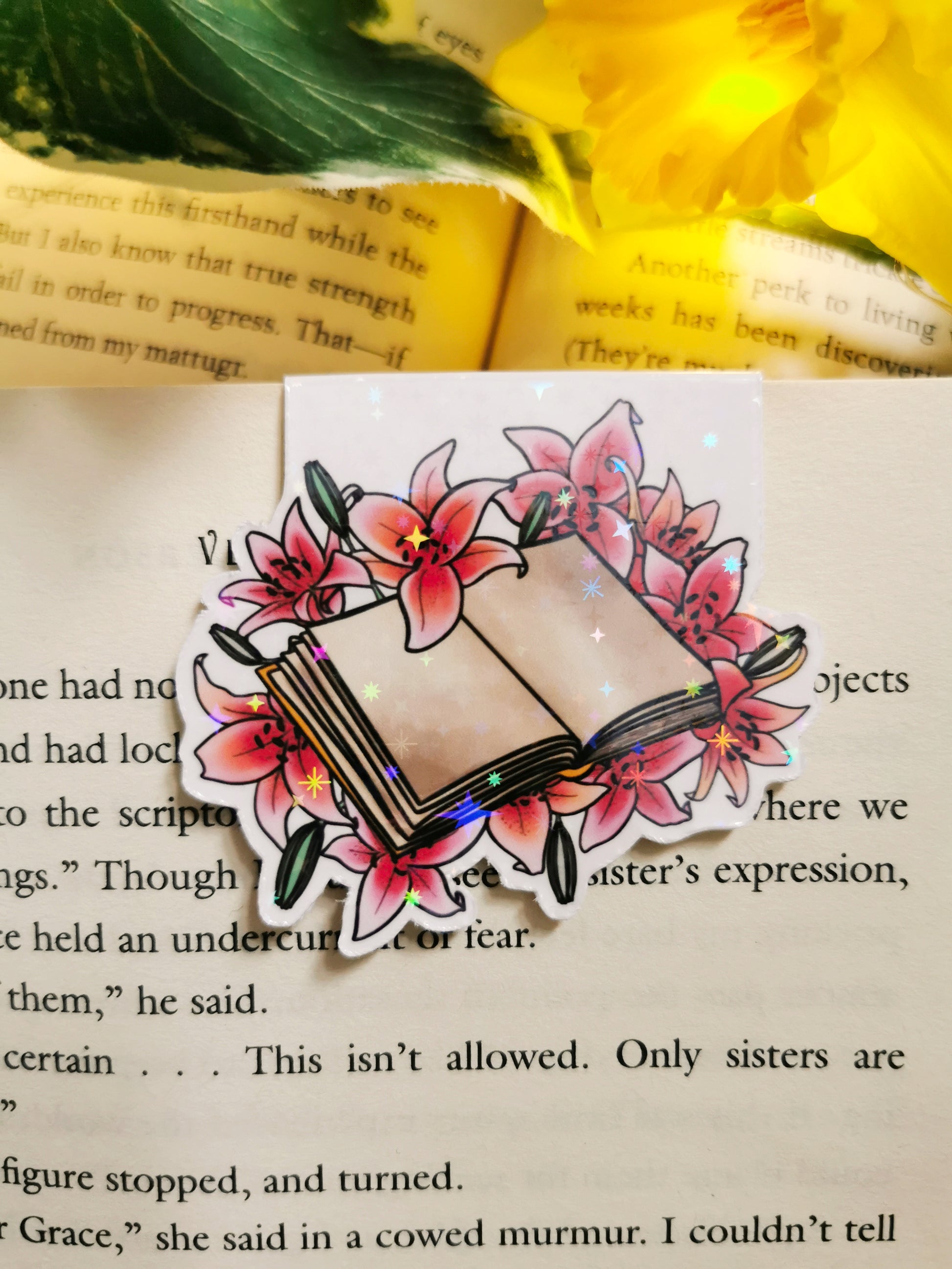 Mark your place in your book or planner with this lily & book holographic magnetic bookmark.