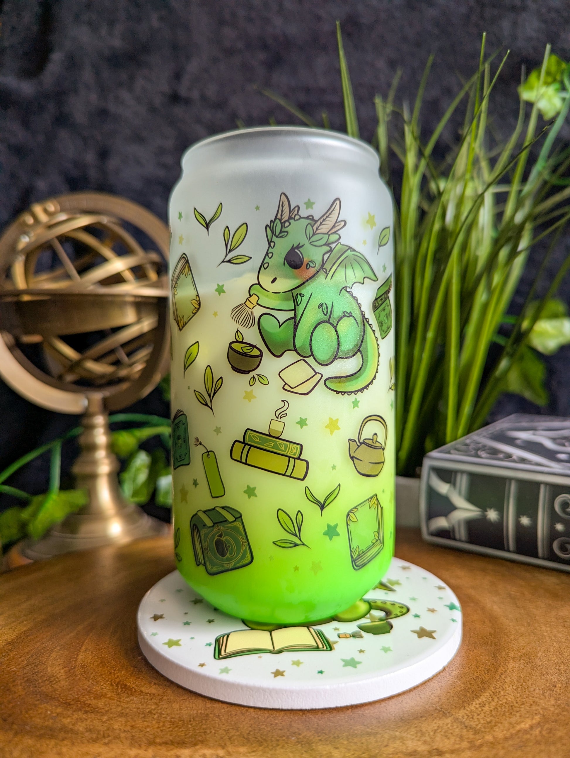 Frosted Glass with a green ombre bottom. Illustrated with cute baby matcha dragons, teapots, books/tomes, bookmarks, tea leaves and stars.