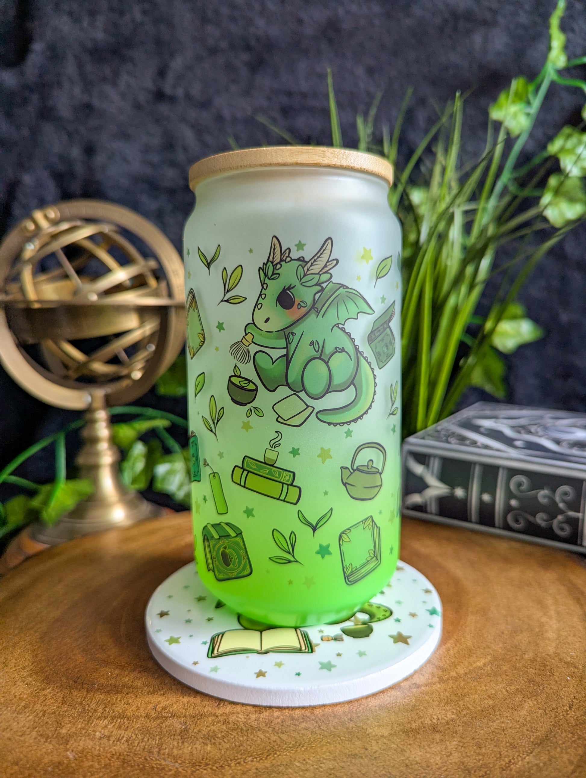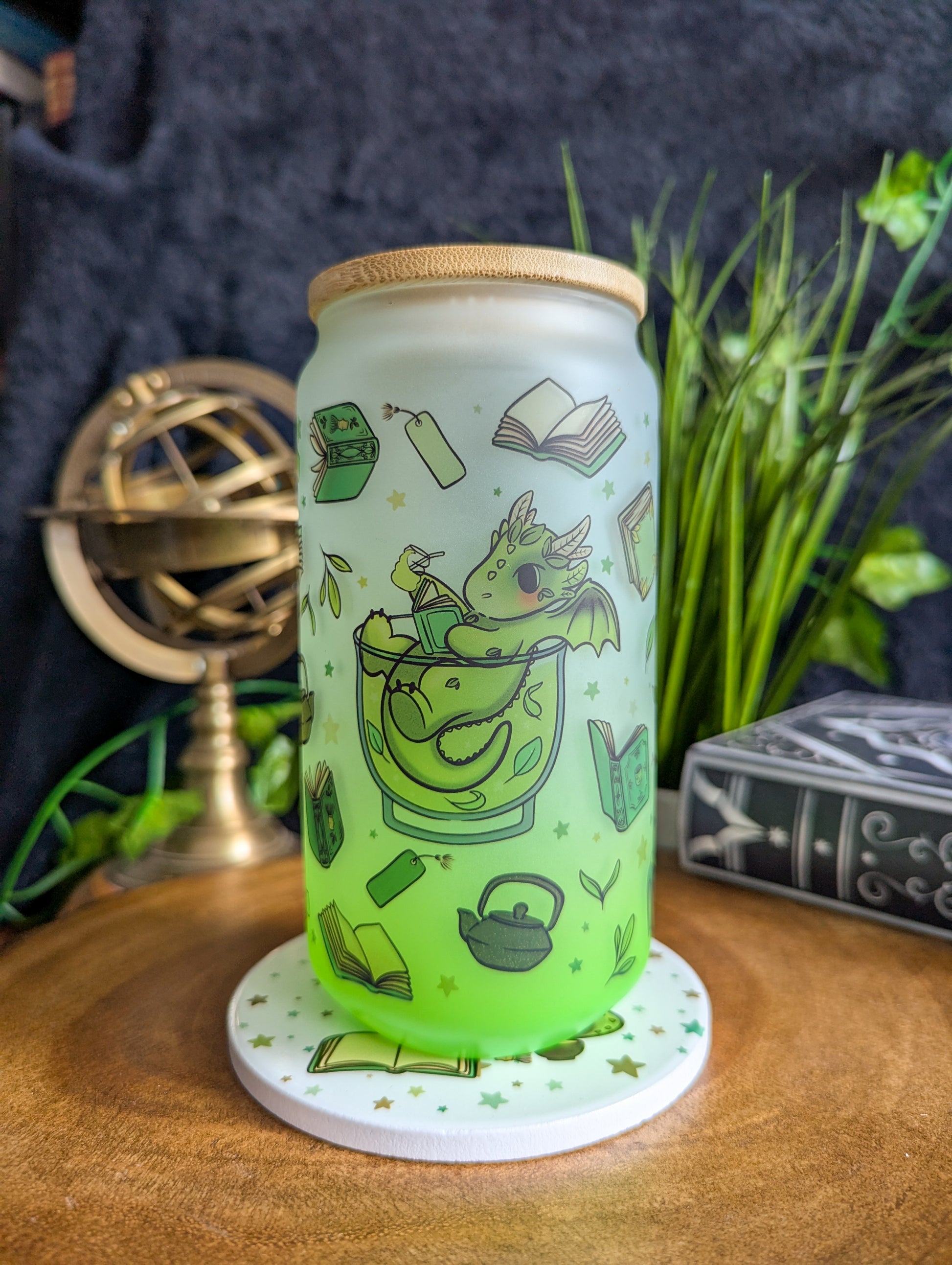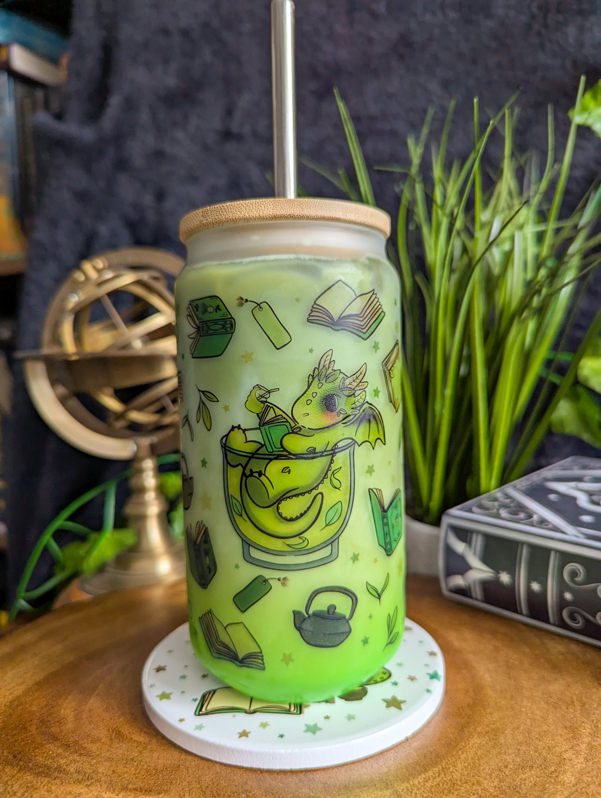 Matcha Book Dragons Can Glass Cup with bamboo lid and straw. The perfect cup for your cold brews, sodas, juice and water for cosy reading sessions.