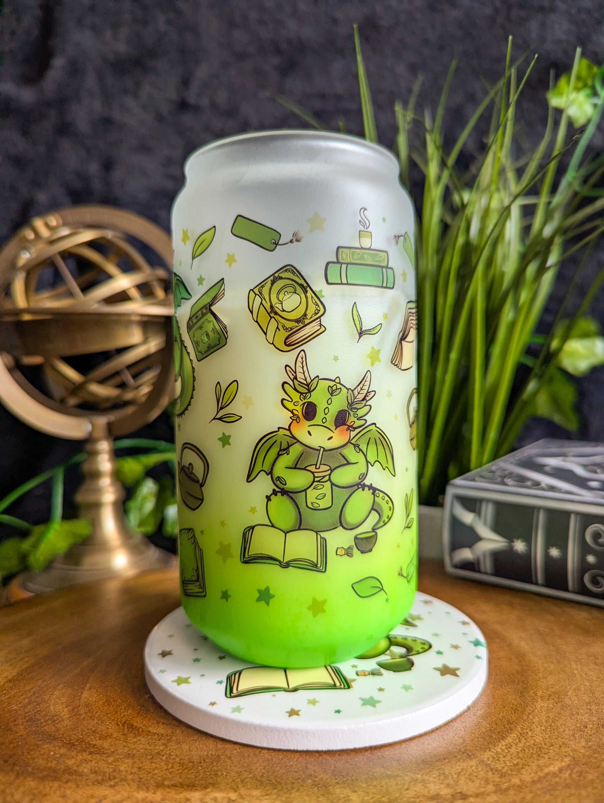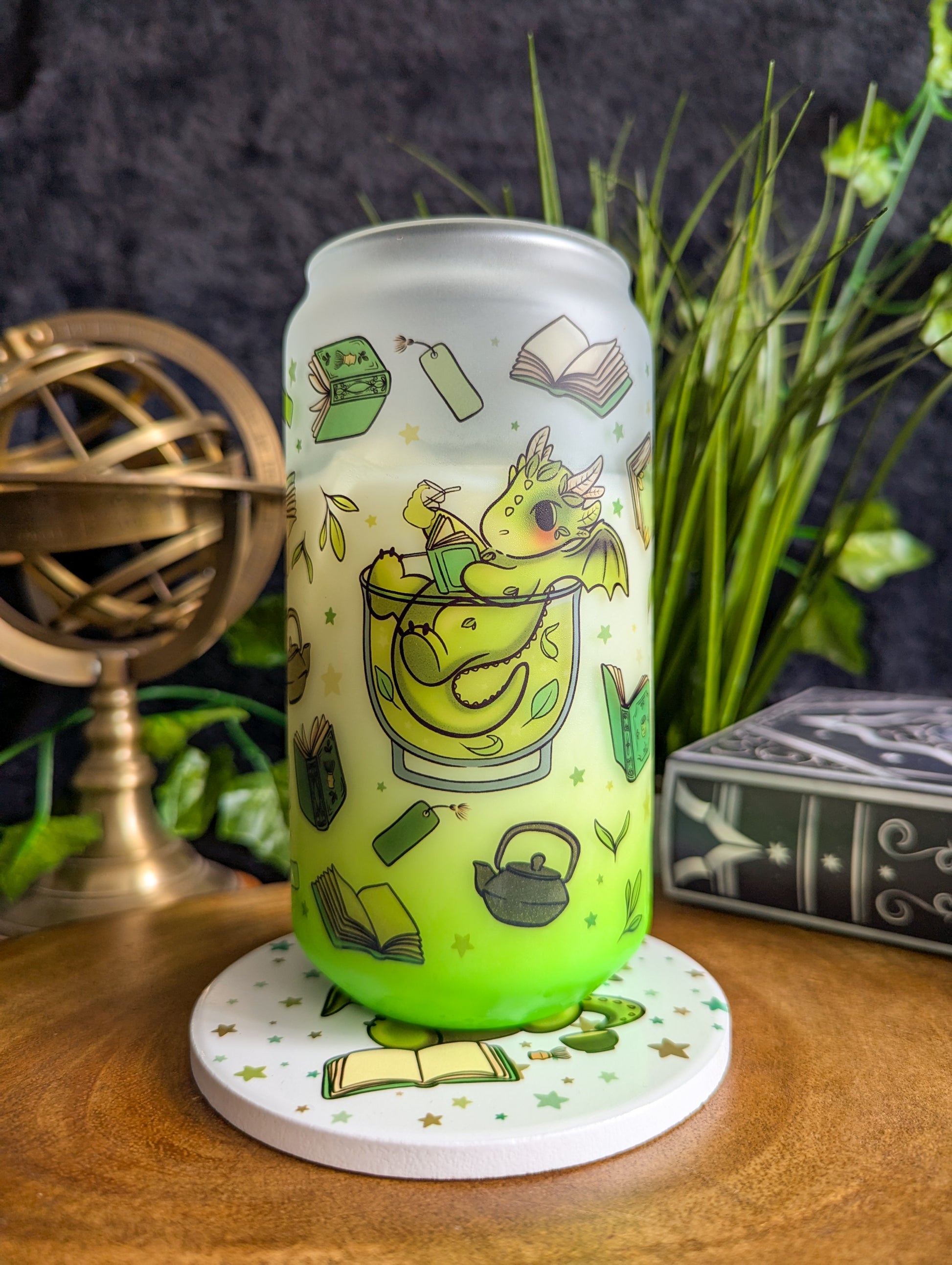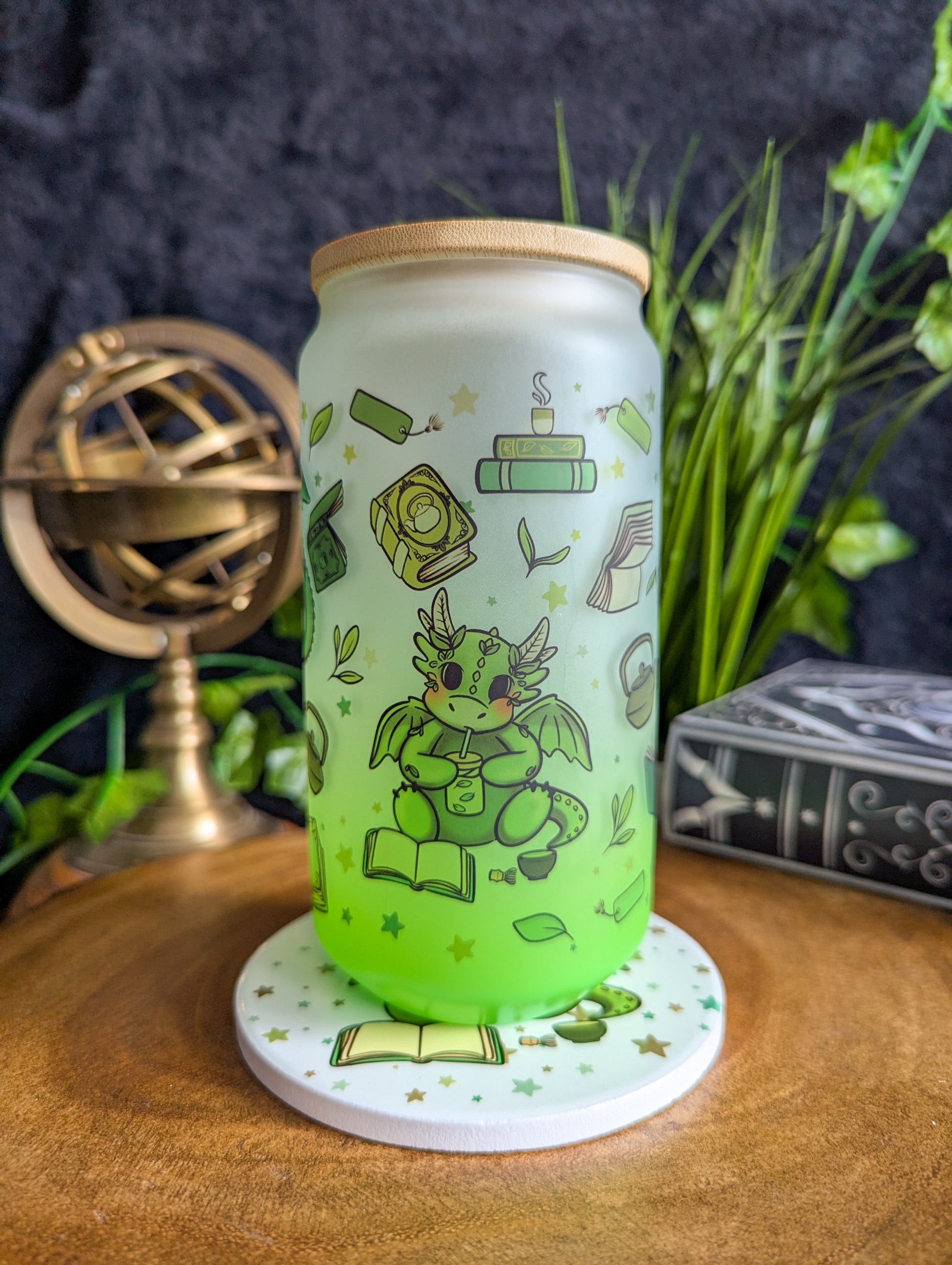Matcha Book Dragons Can Glass Cup with bamboo lid and straw. The perfect cup for your cold brews, sodas, juice and water for cosy reading sessions.