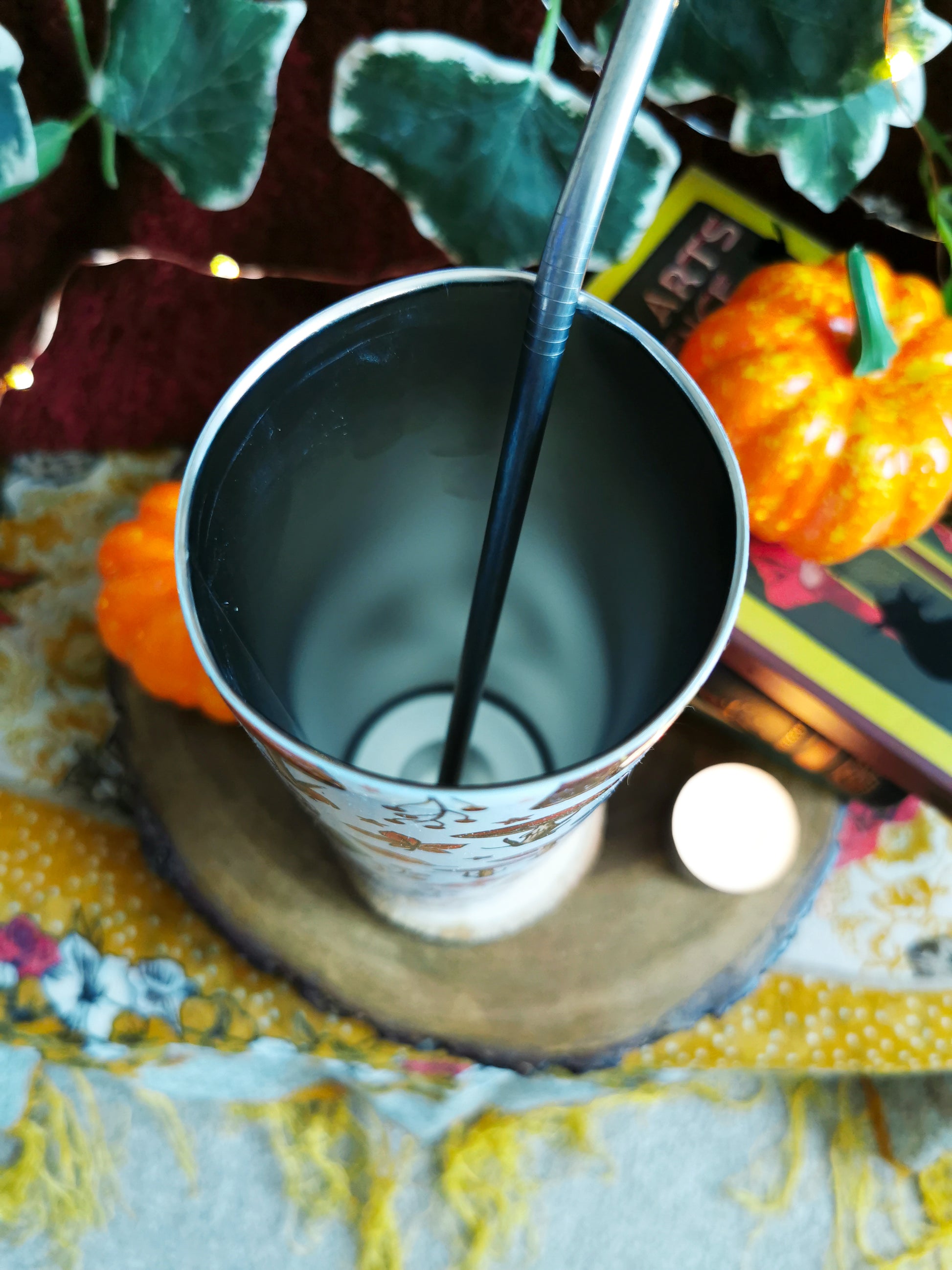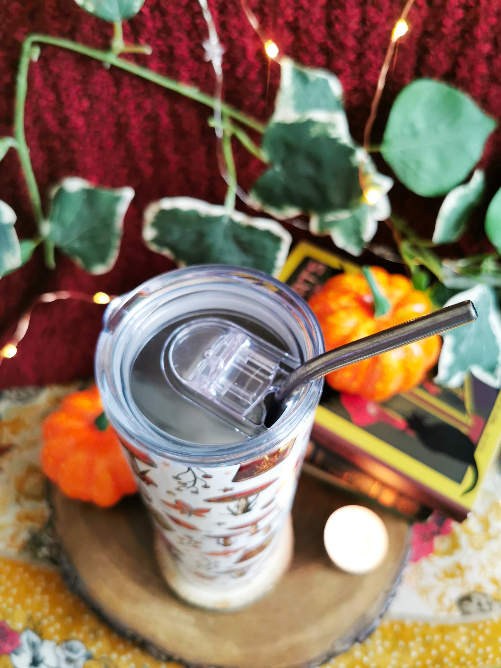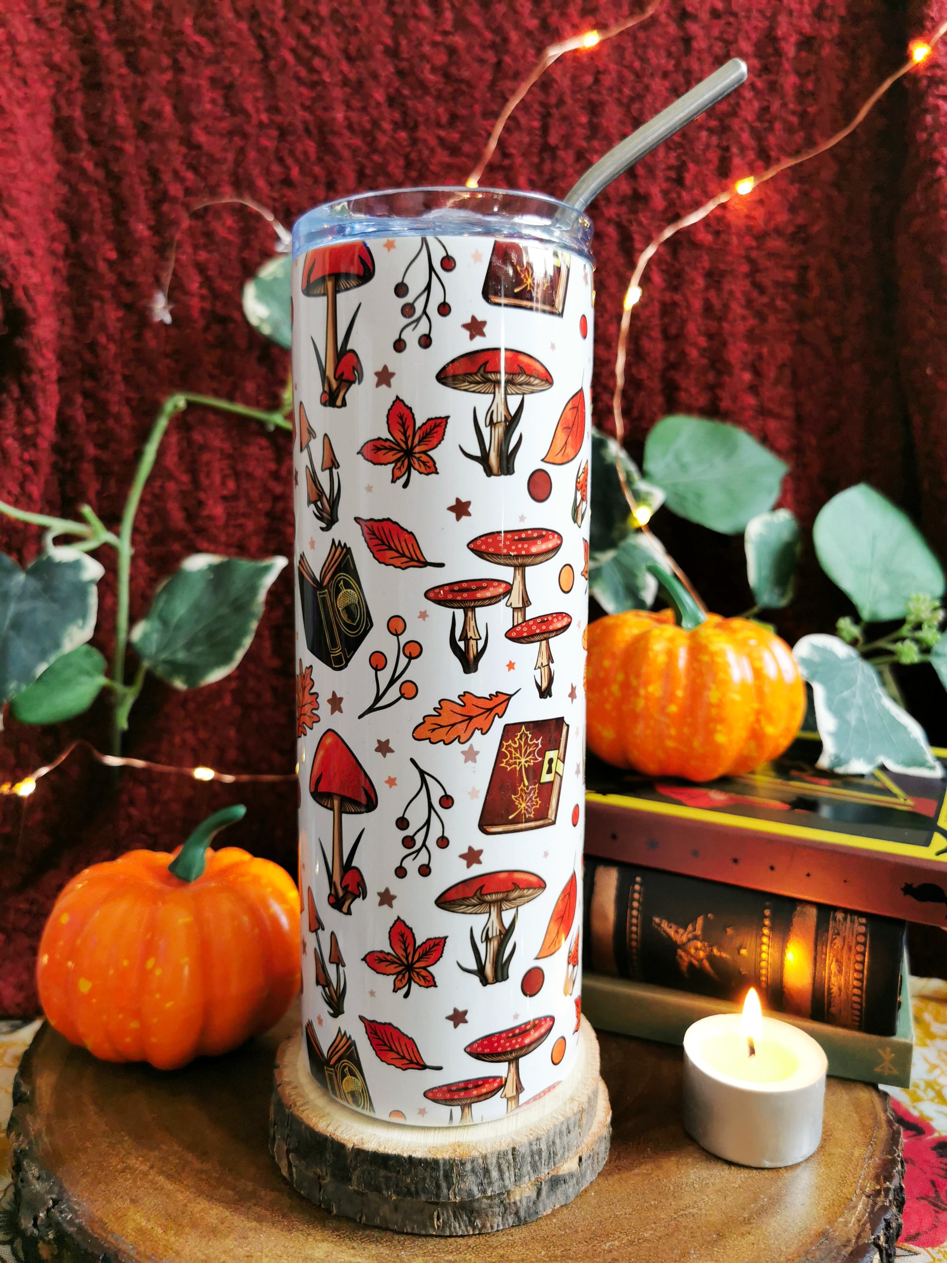 Drink your fave hot or cold beverages this autumn/fall in this Mushroom and Tomes 600ml slim tumbler. Comes with a metal straw.