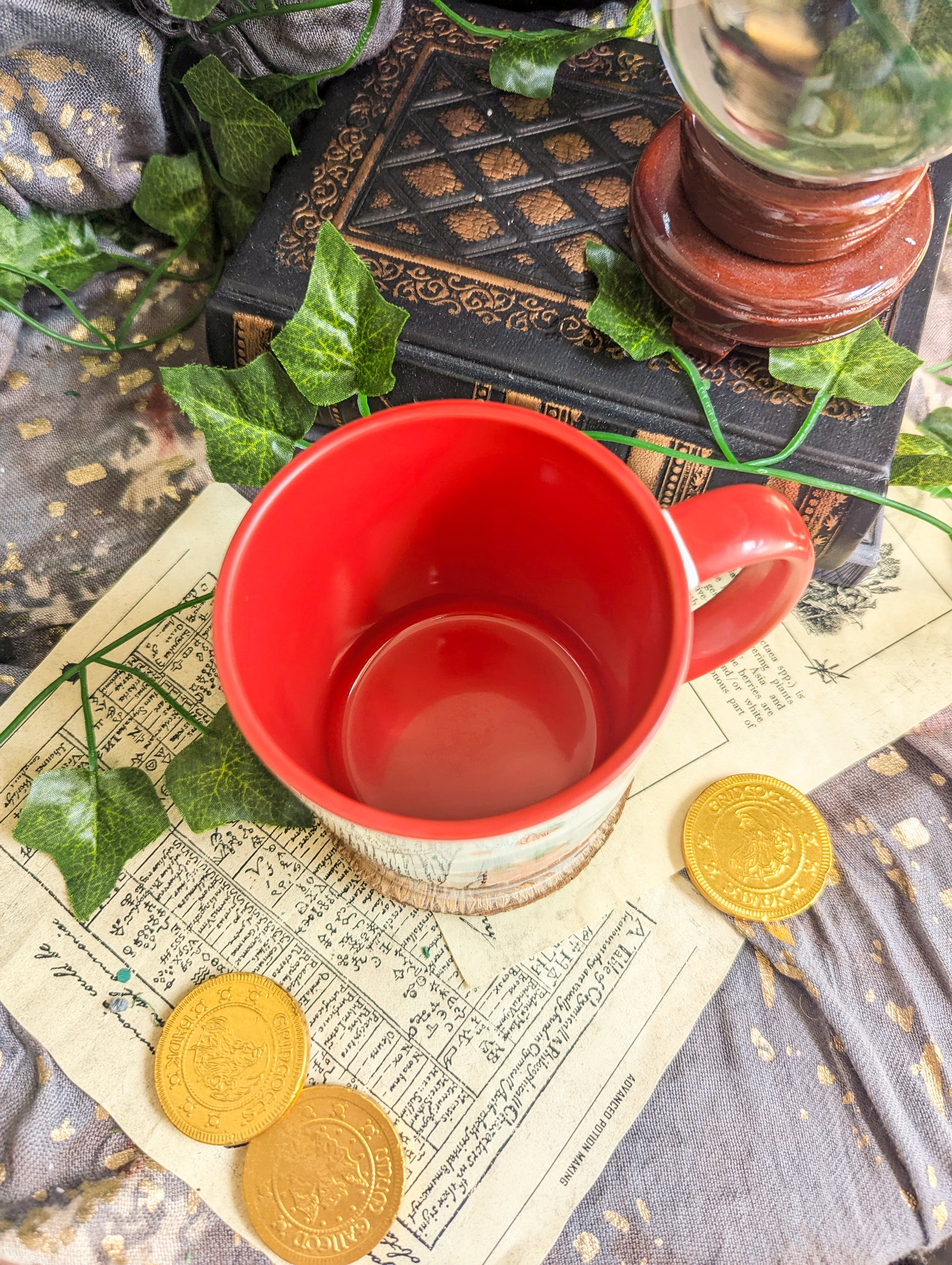 The handle and inside of the mug is a bright red.