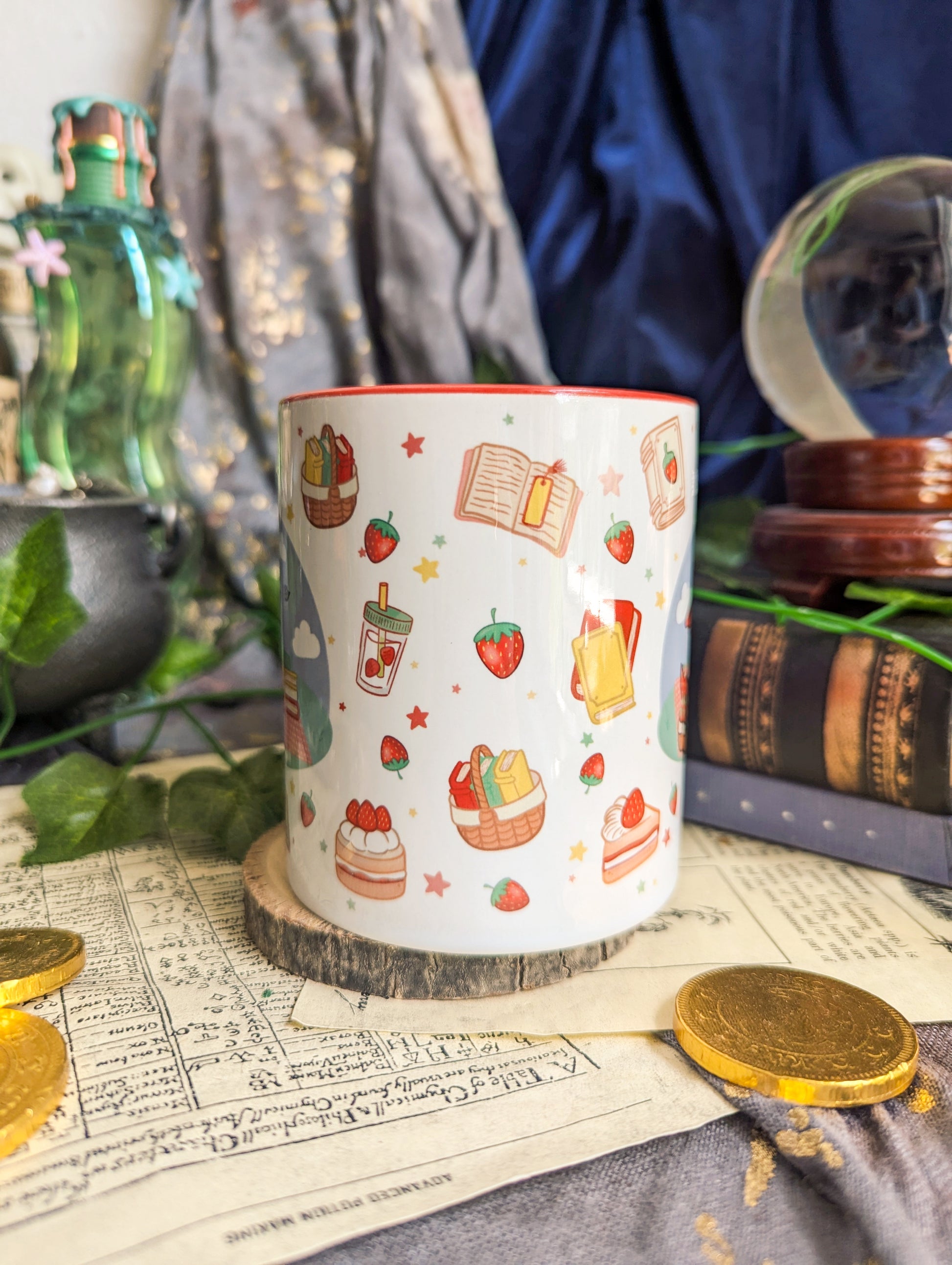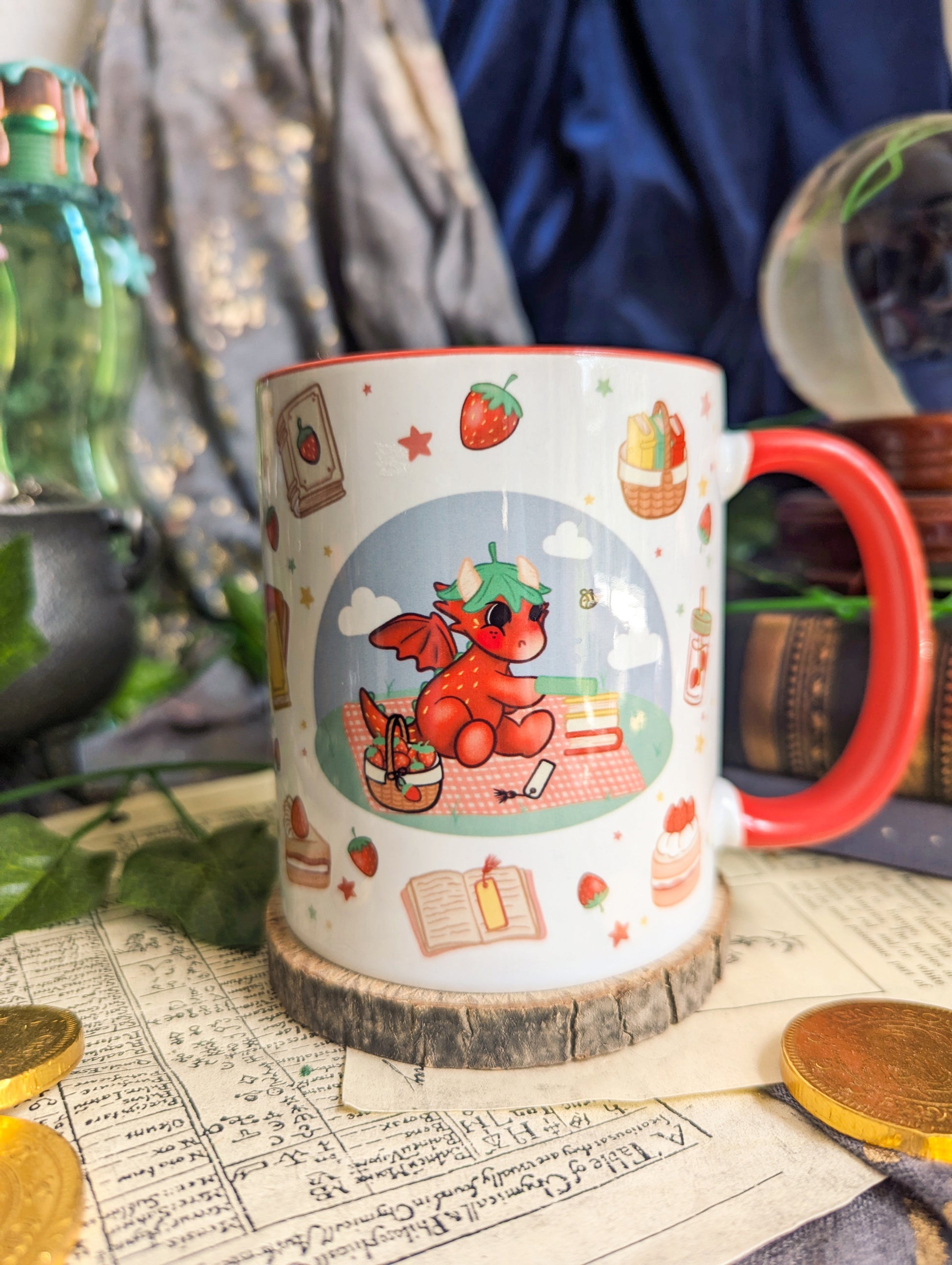 Sip your favourite beverage from this Strawberry Dragon Ceramic Mug. The design features a Strawberry Dragon enjoying a picnic and books, picnic basket, strawberries, books and cake.