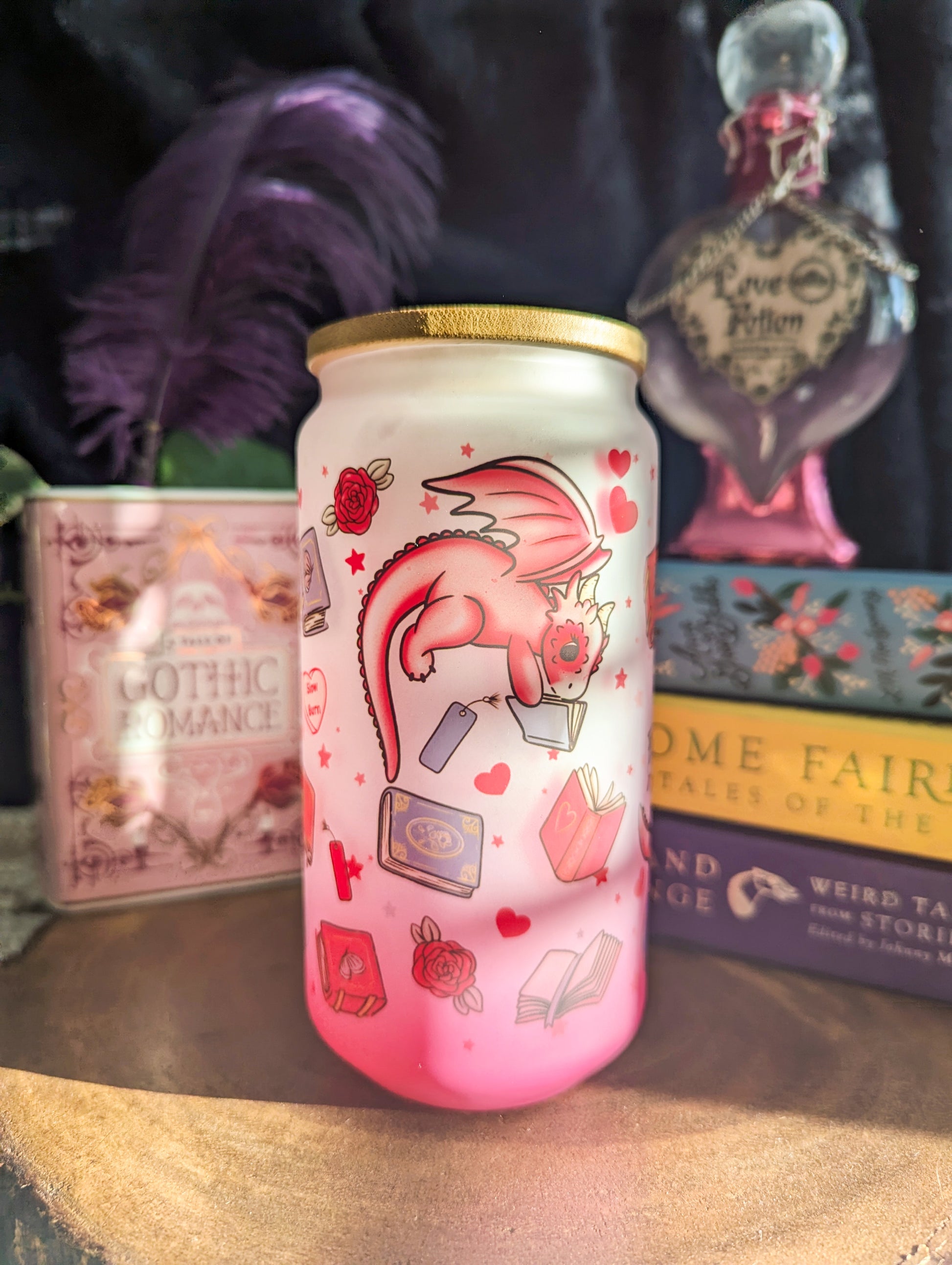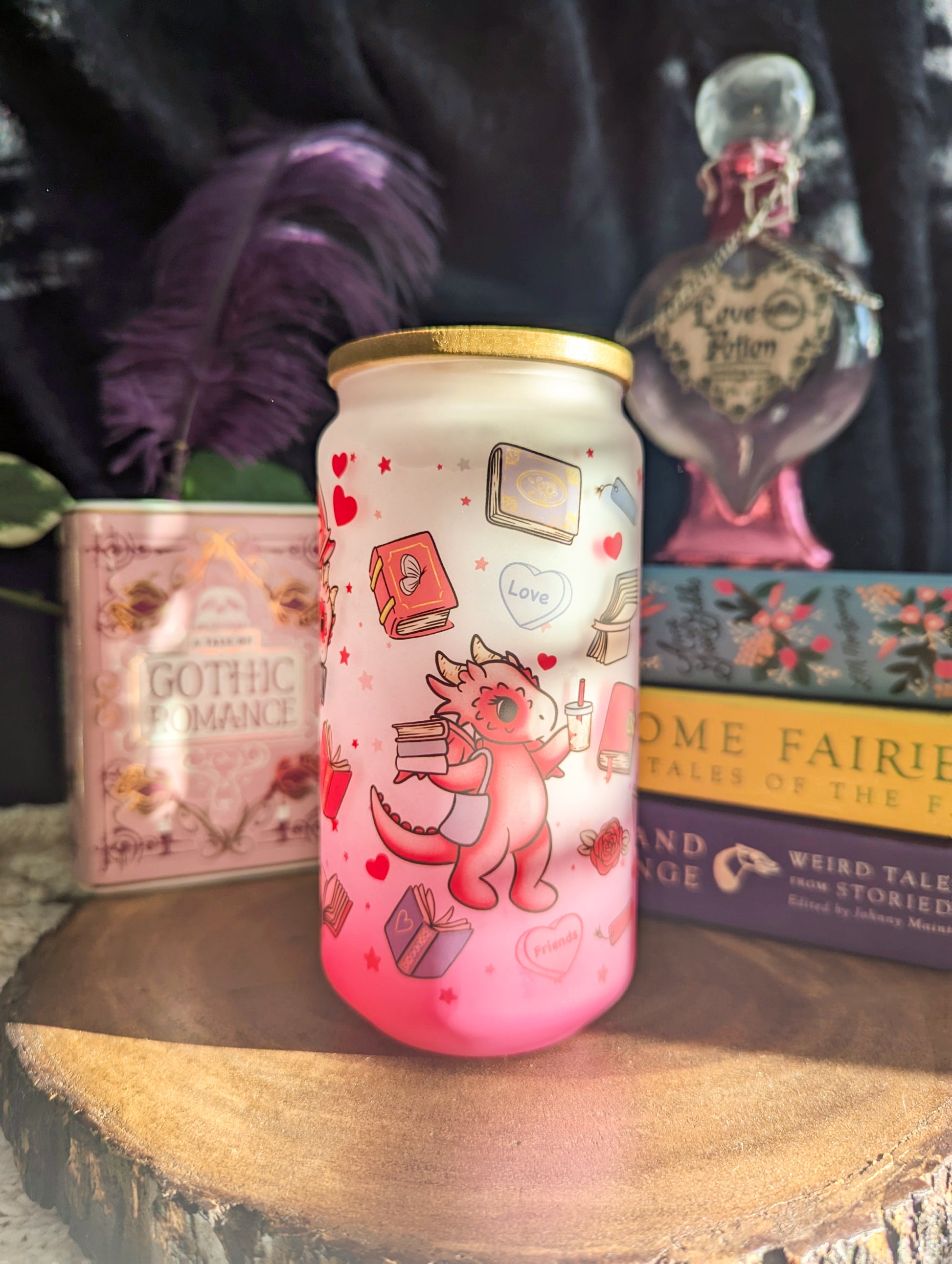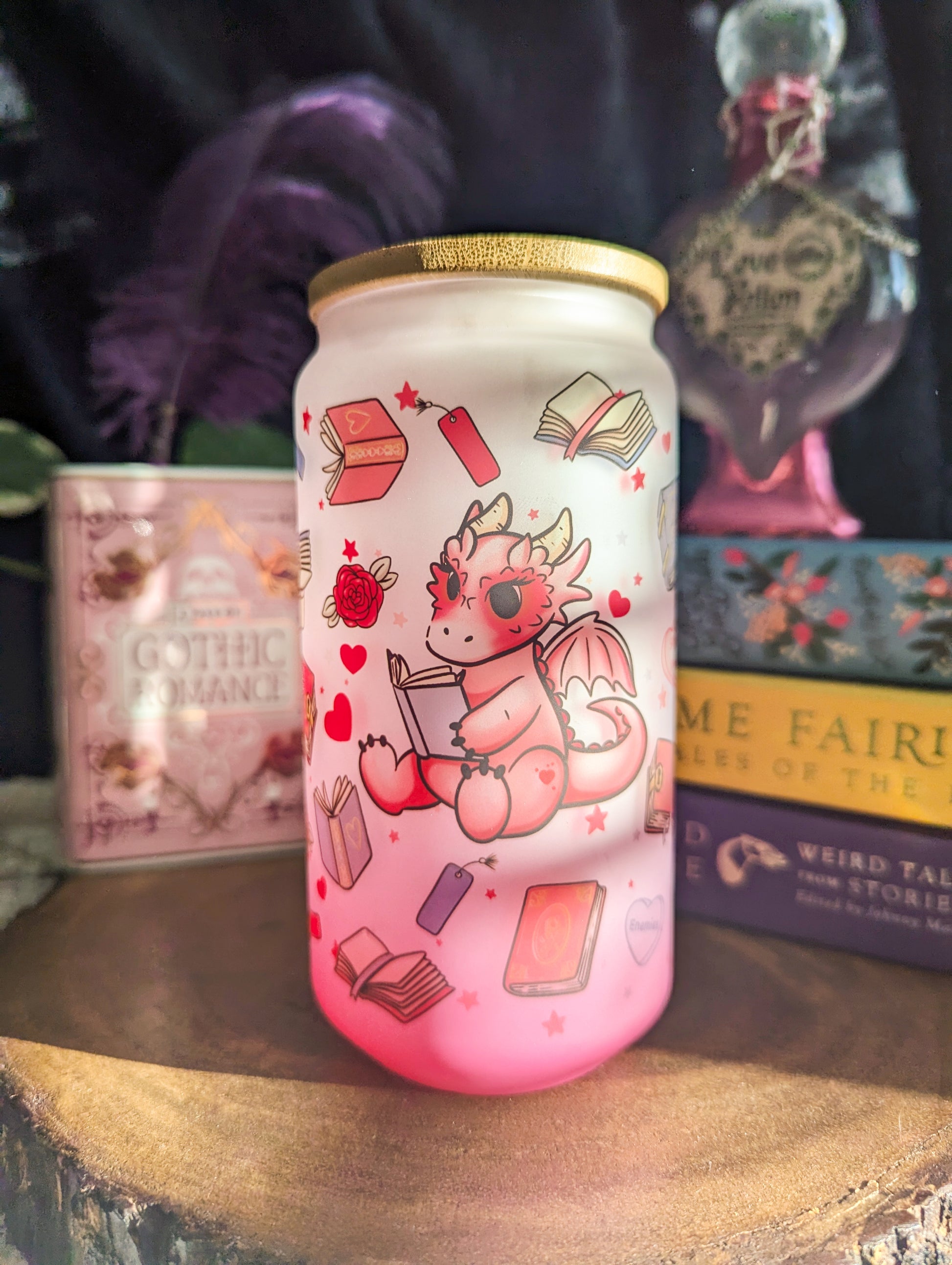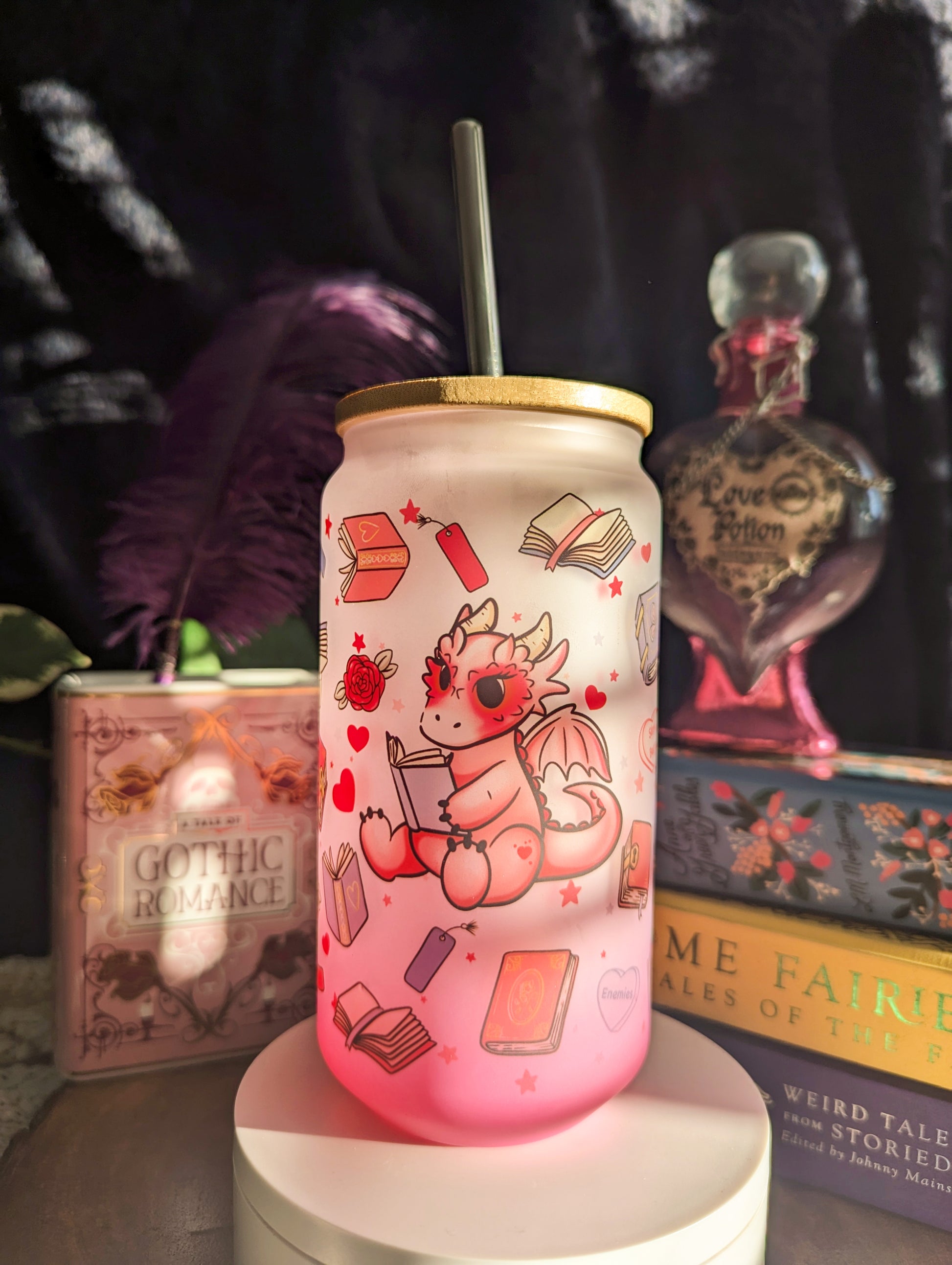Frosted Glass with pink/purple ombre bottom. Illustrated with cute baby dragons, hearts, books/tomes, roses, and stars.