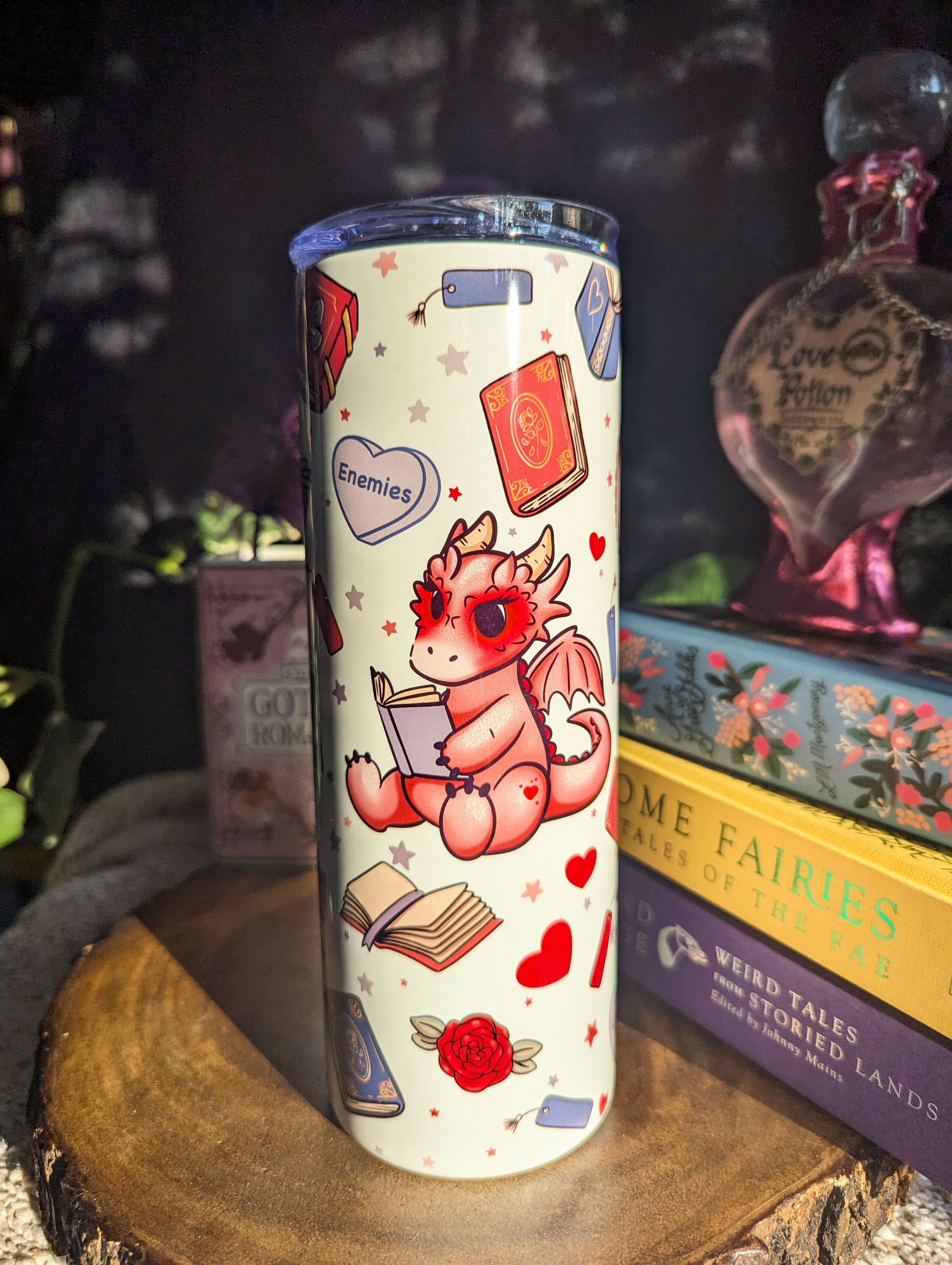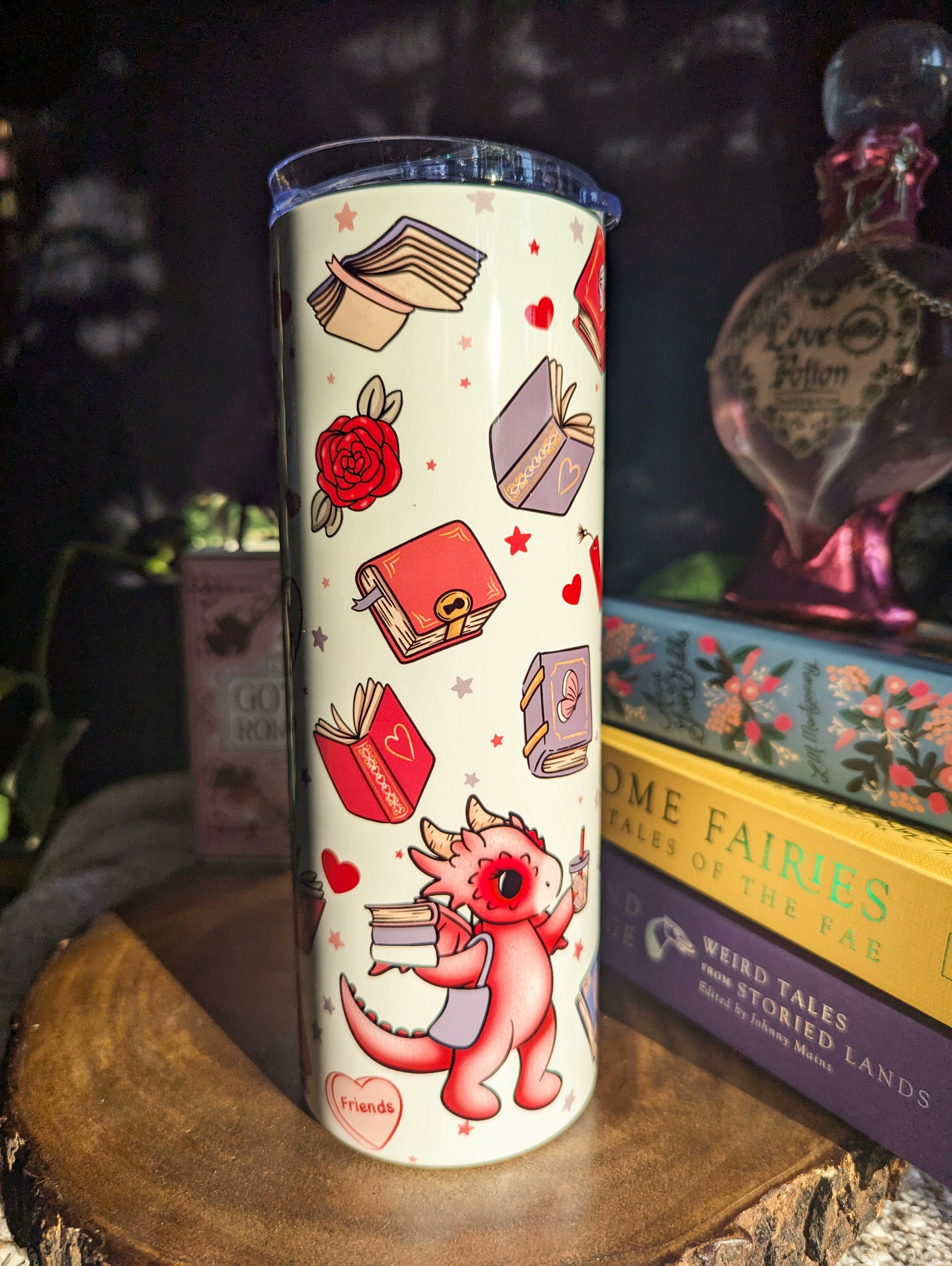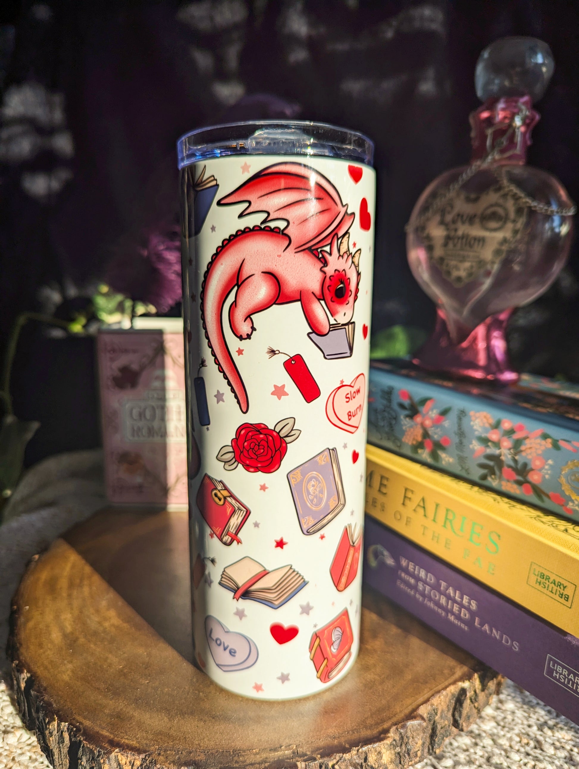 Original design is sublimated on the bottle in my little home studio in Livingston, Scotland. Design features cute pink baby dragons, books/tomes, hearts, roses and stars.