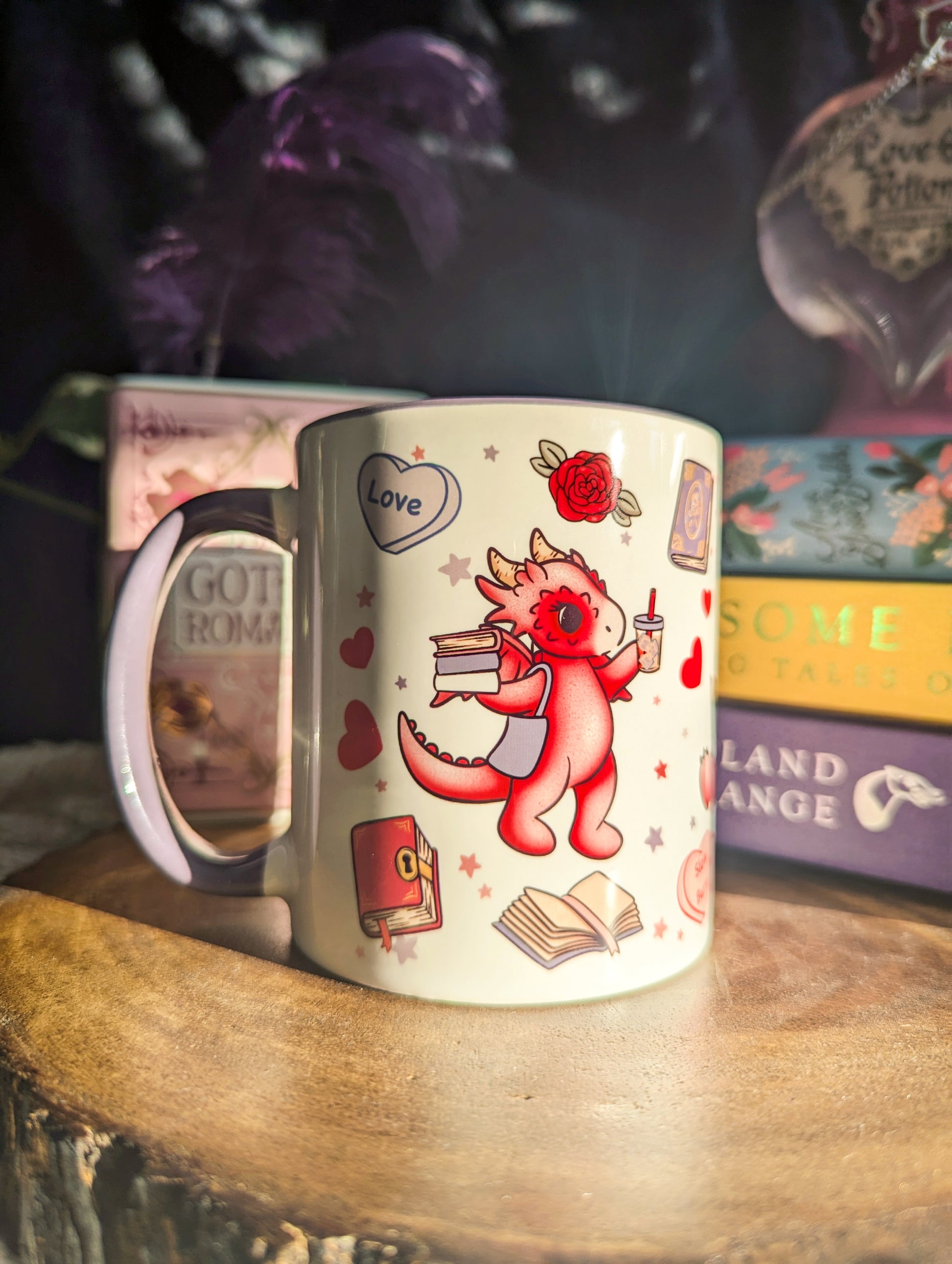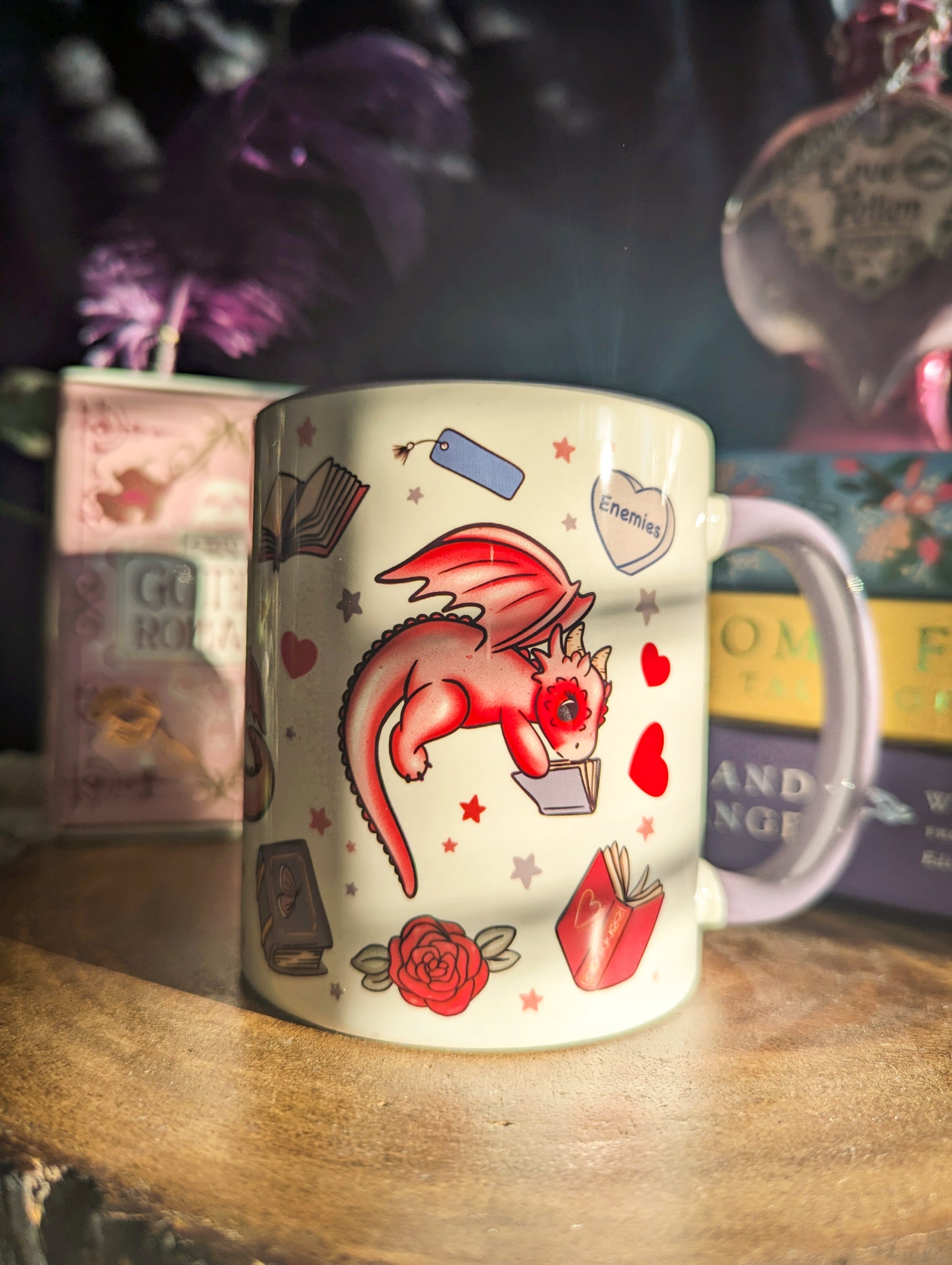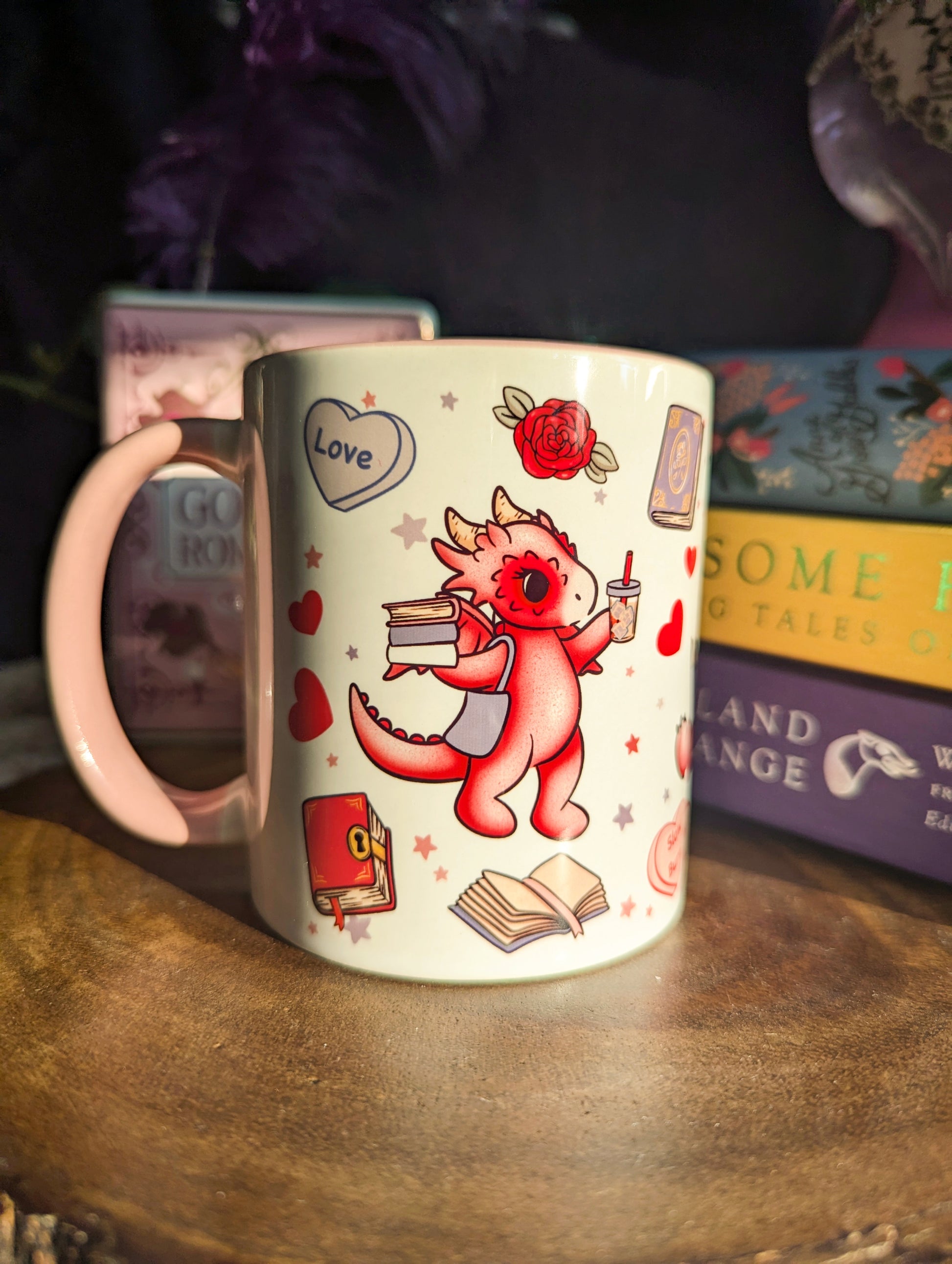 Sip your favourite hot beverage from this Pink Dragon Ceramic Mug. The design features our cute pink baby dragons reading fantasy books among roses, books, hearts and stars.
