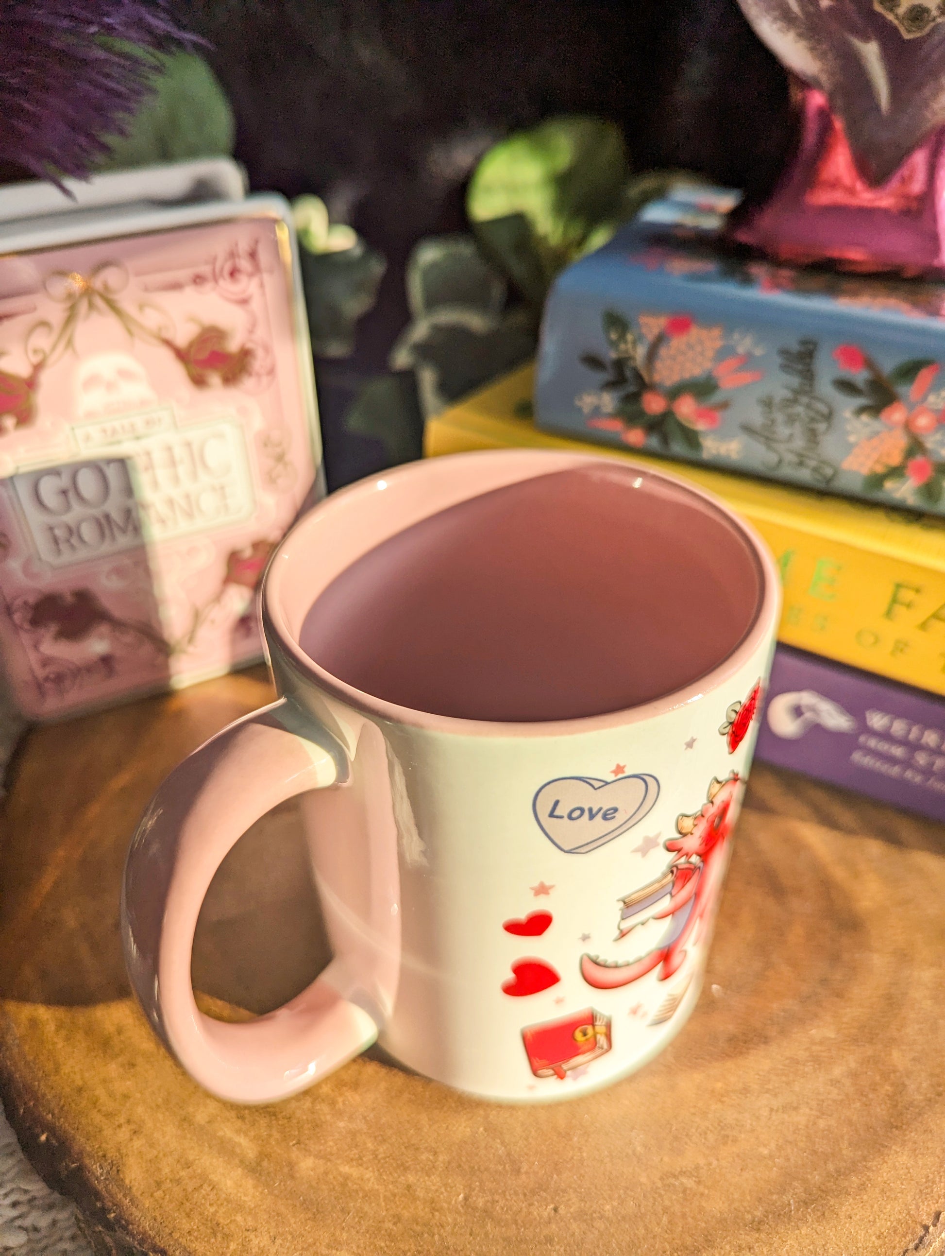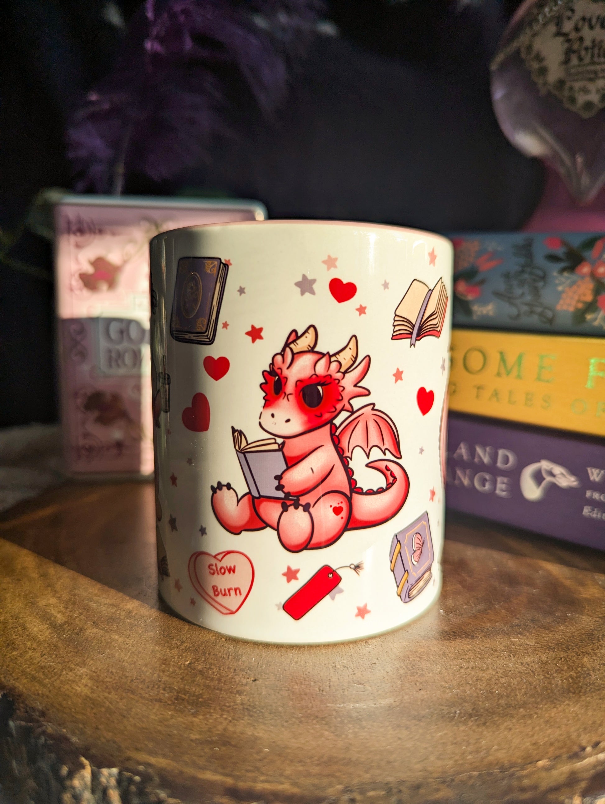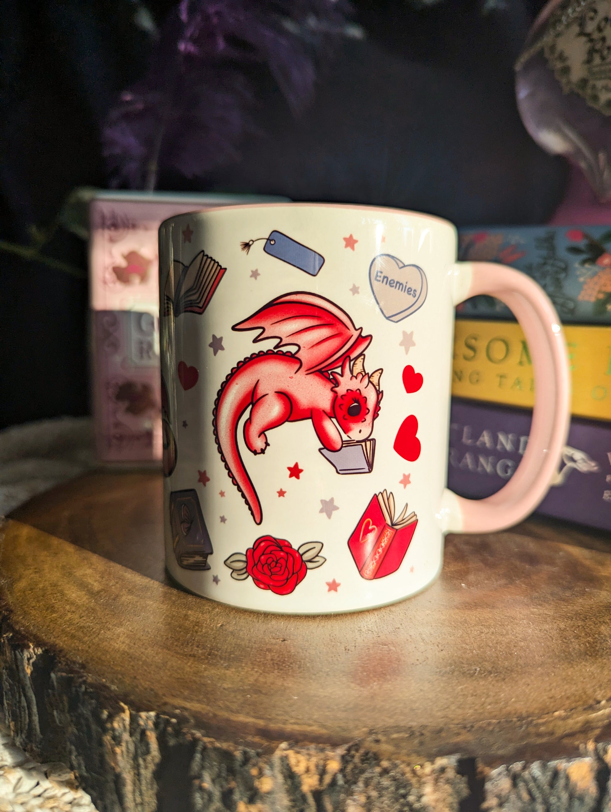 Sip your favourite hot beverage from this Pink Dragon Ceramic Mug. The design features our cute pink baby dragons reading fantasy books among roses, books, hearts and stars.
