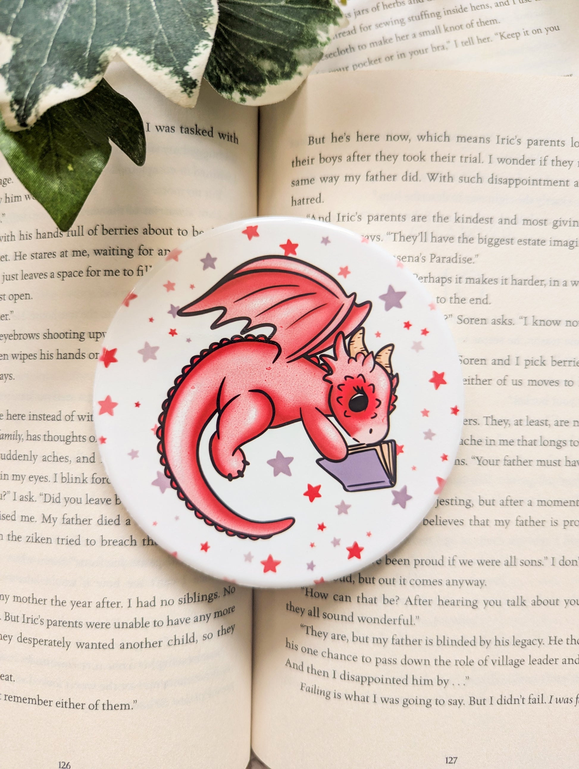 The white coaster is 10.5cm diameter and features our original illustration of a pink flying dragon reading a book.