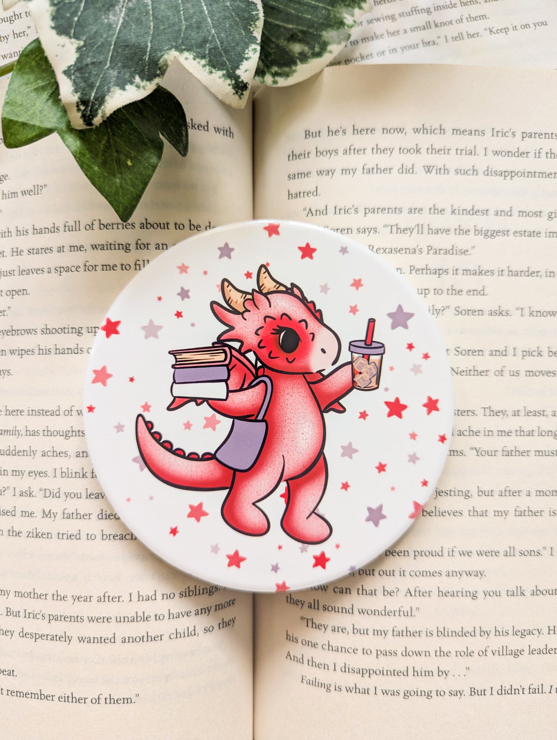 The white coaster is 10.5cm diameter and features our original illustration of a pink shopping dragon reading a book.