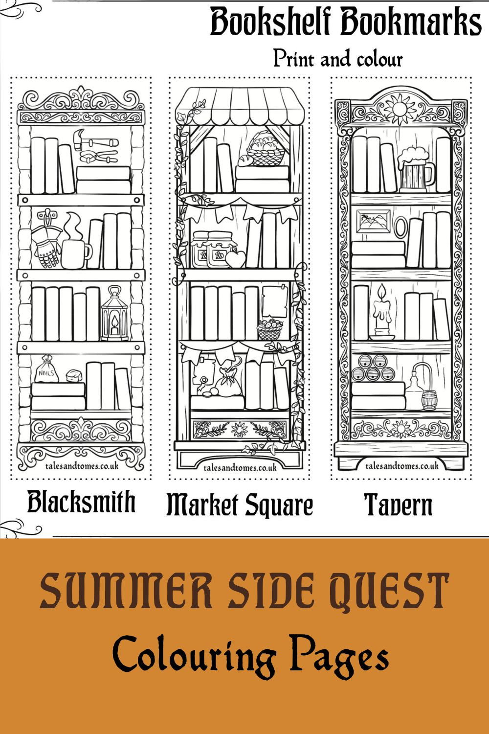 One page printable PDF with 3 bookshelf bookmarks - one for each location (Tavern, Market, Blacksmith)