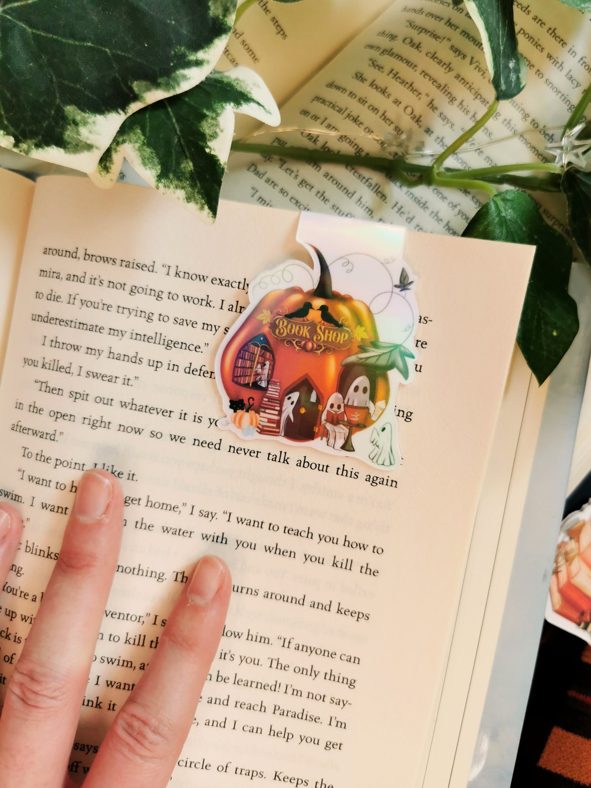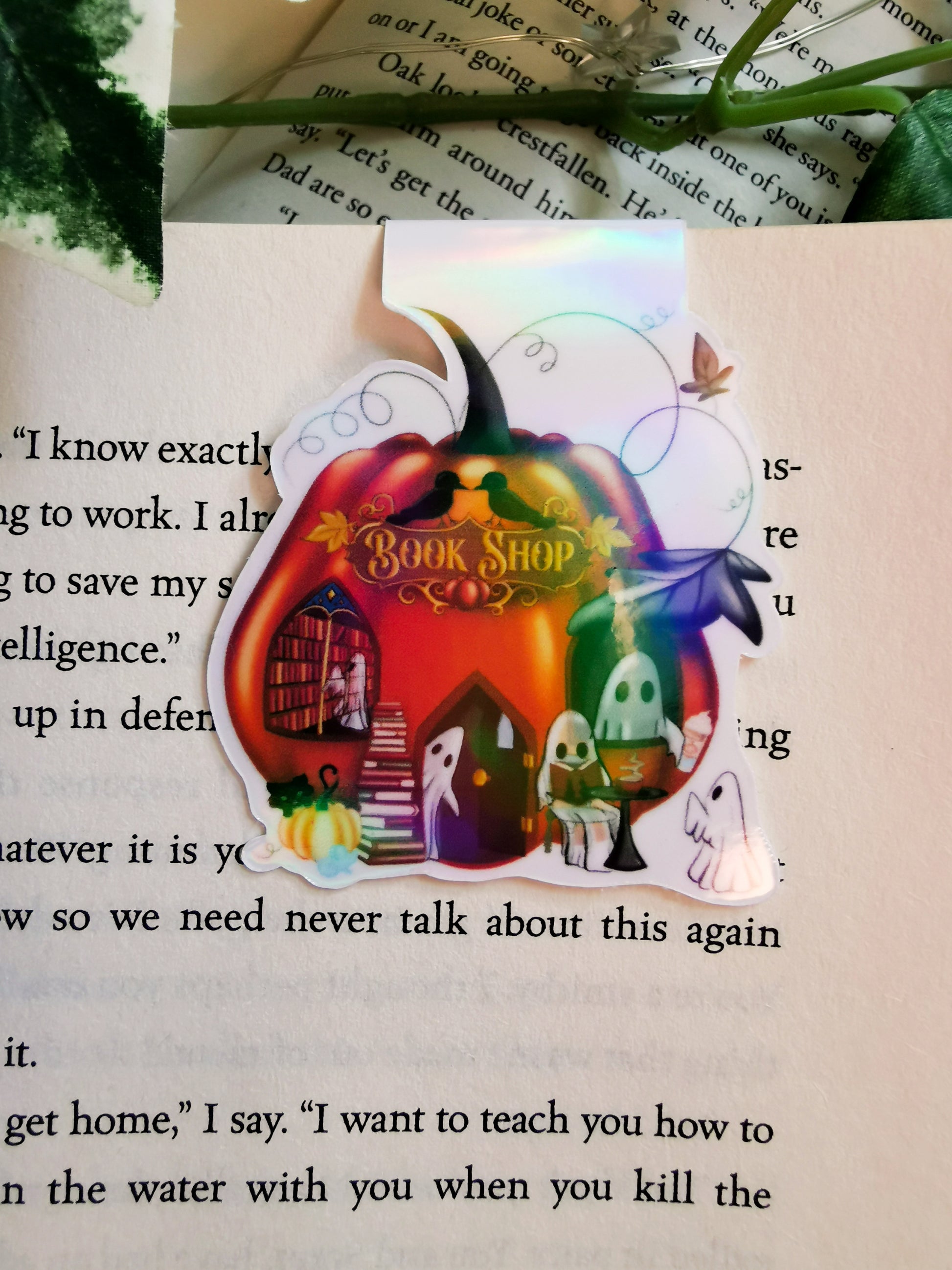 Mark your place in your book or planner this autumn/fall with this pumpkin bookshop holographic magnetic bookmark.