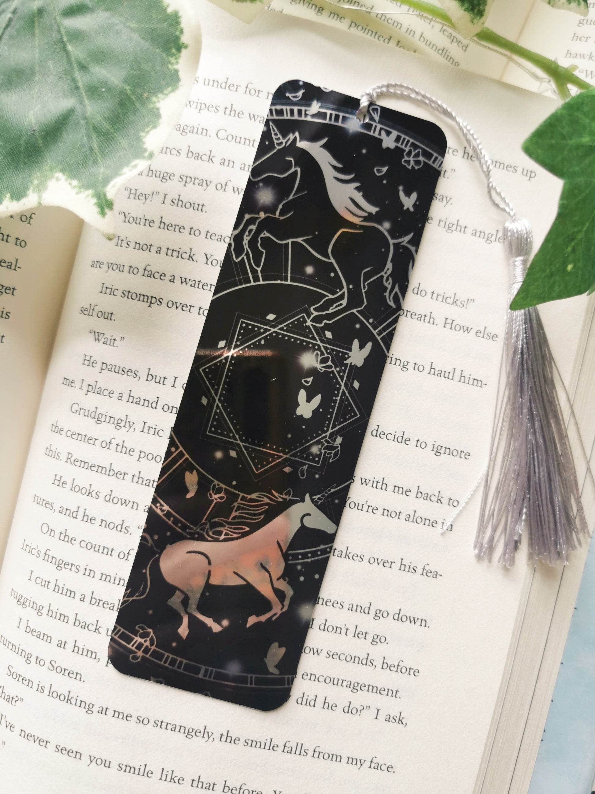 Original Illustration printed on high quality 6” x 2” aluminium 0.5mm & finished with a silver tassel. Design features unicorns, stars and butterflies in mirror silver. Please note the colour of the artwork/product can vary on each device screen.