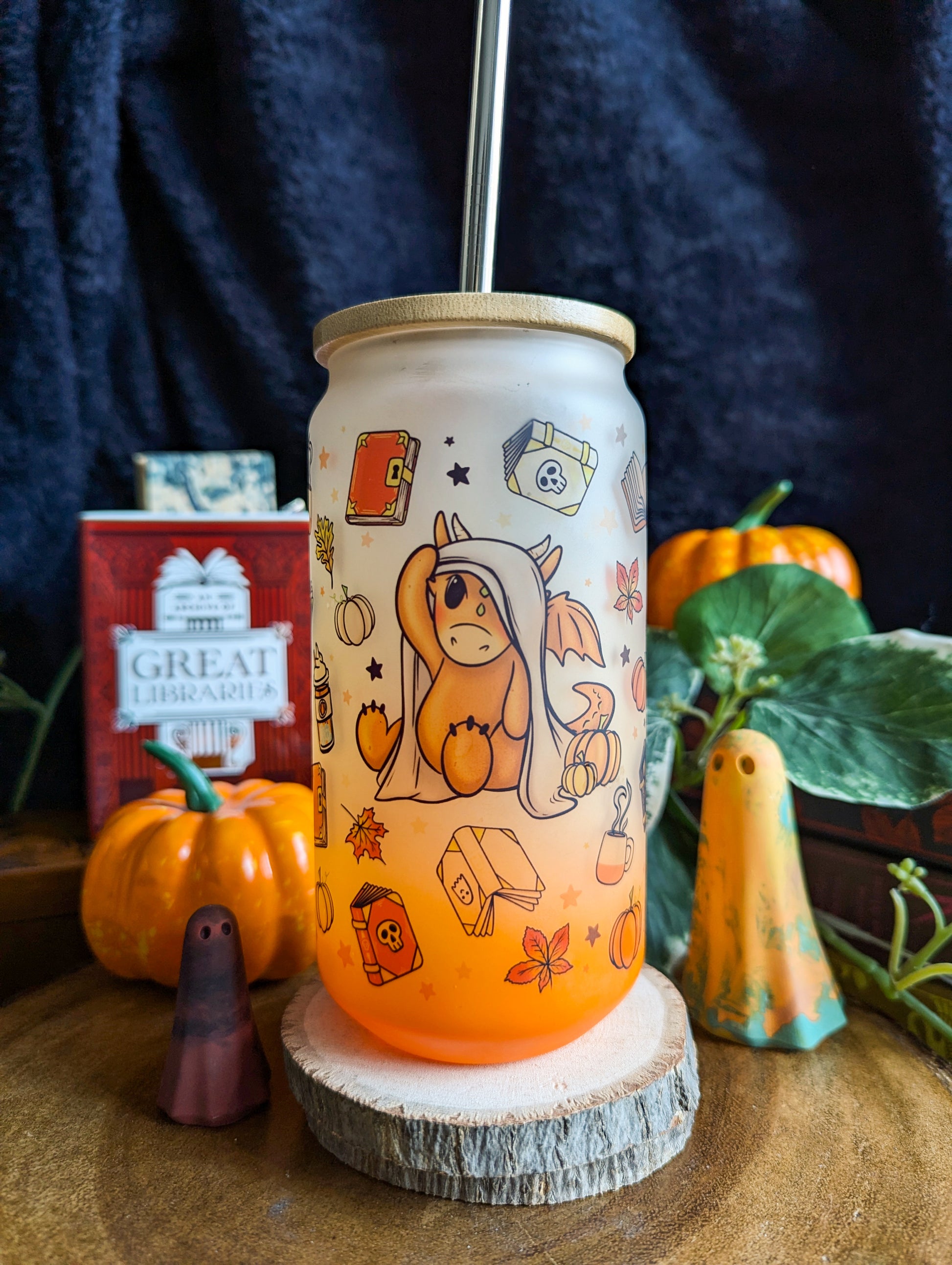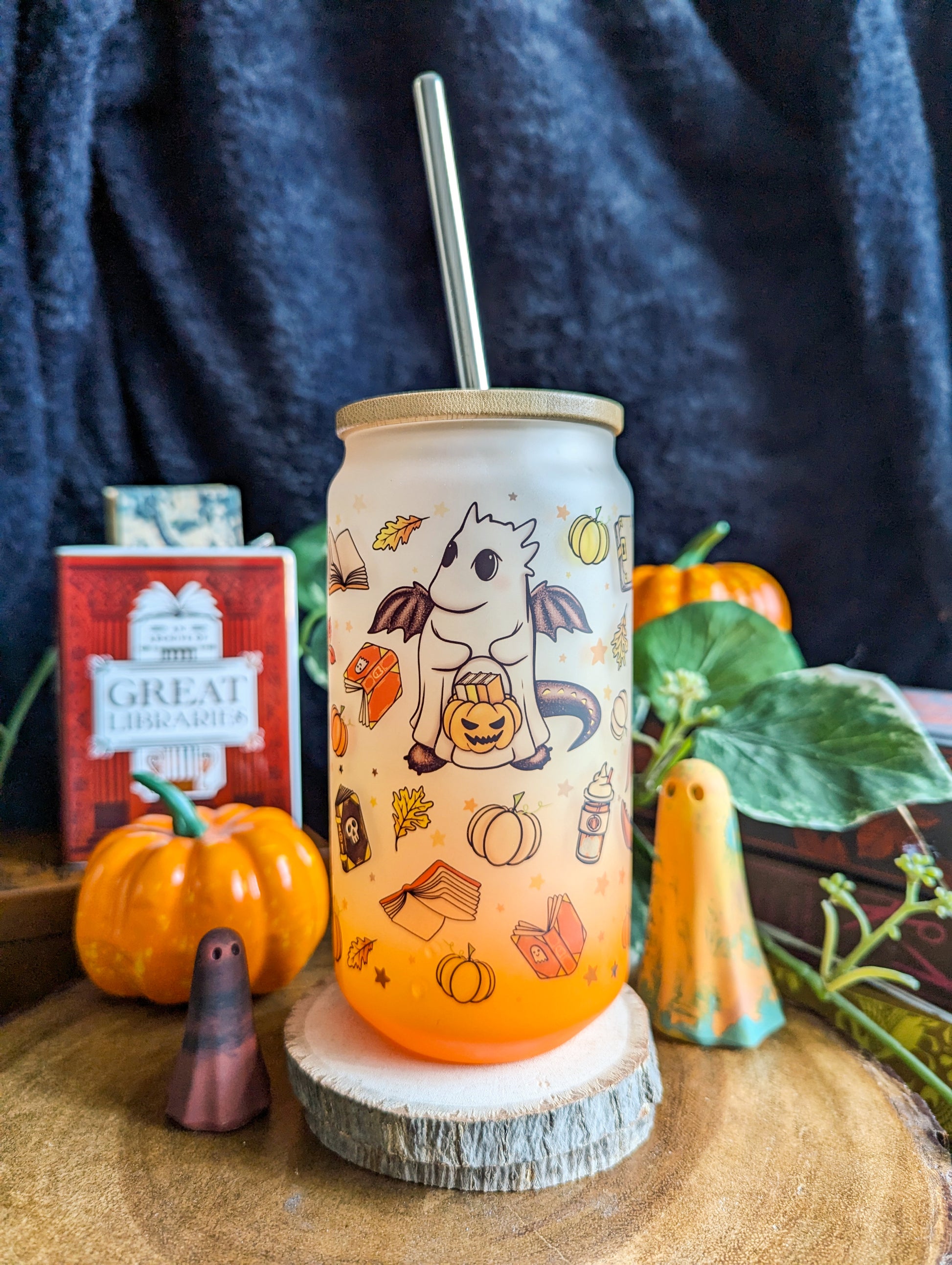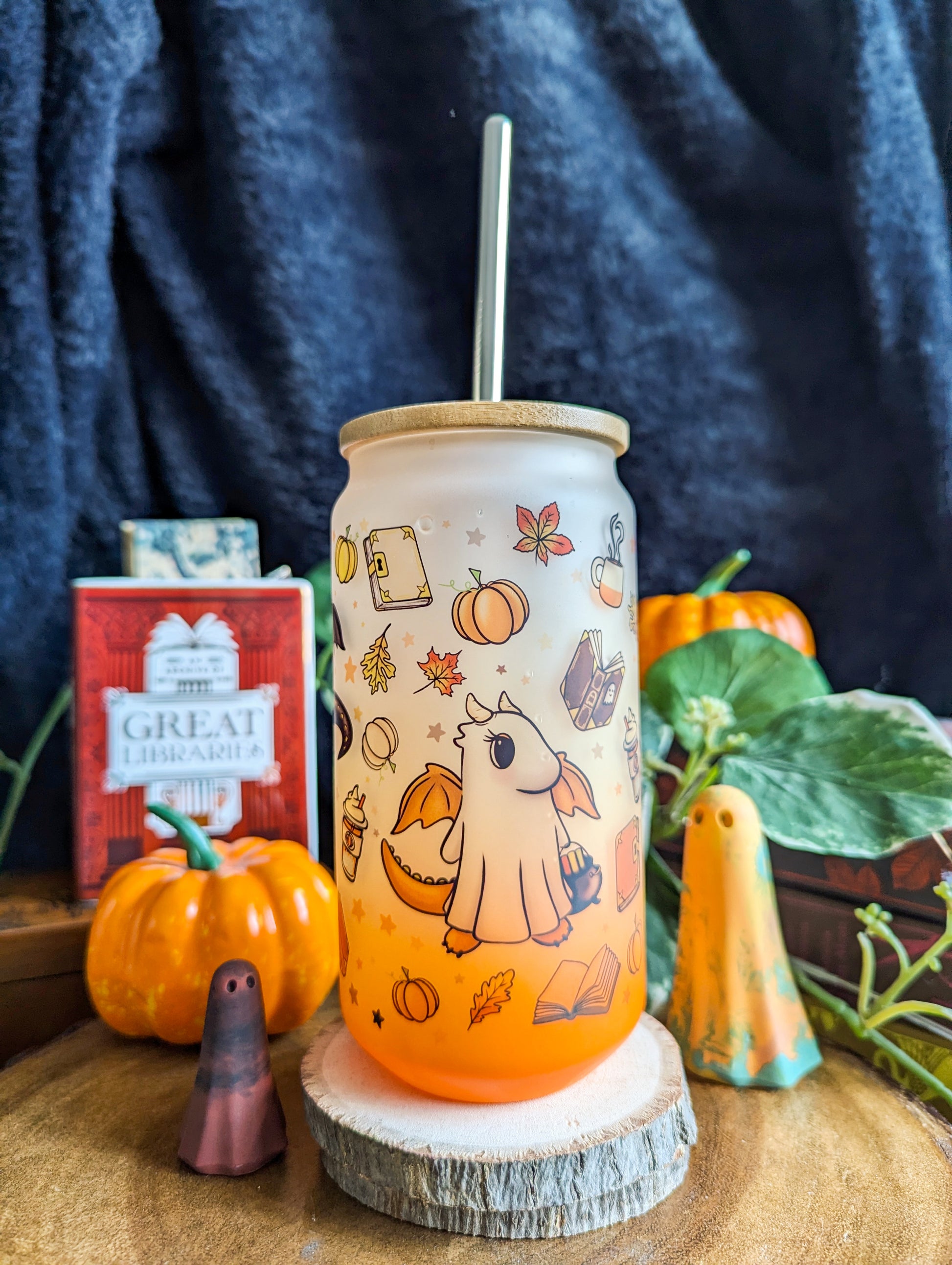 Frosted Glass with an orange ombre bottom. Illustrated with cute baby dragons dressed as ghosts, books/tomes, pumpkin spiced lattes, autumn leaves and stars.