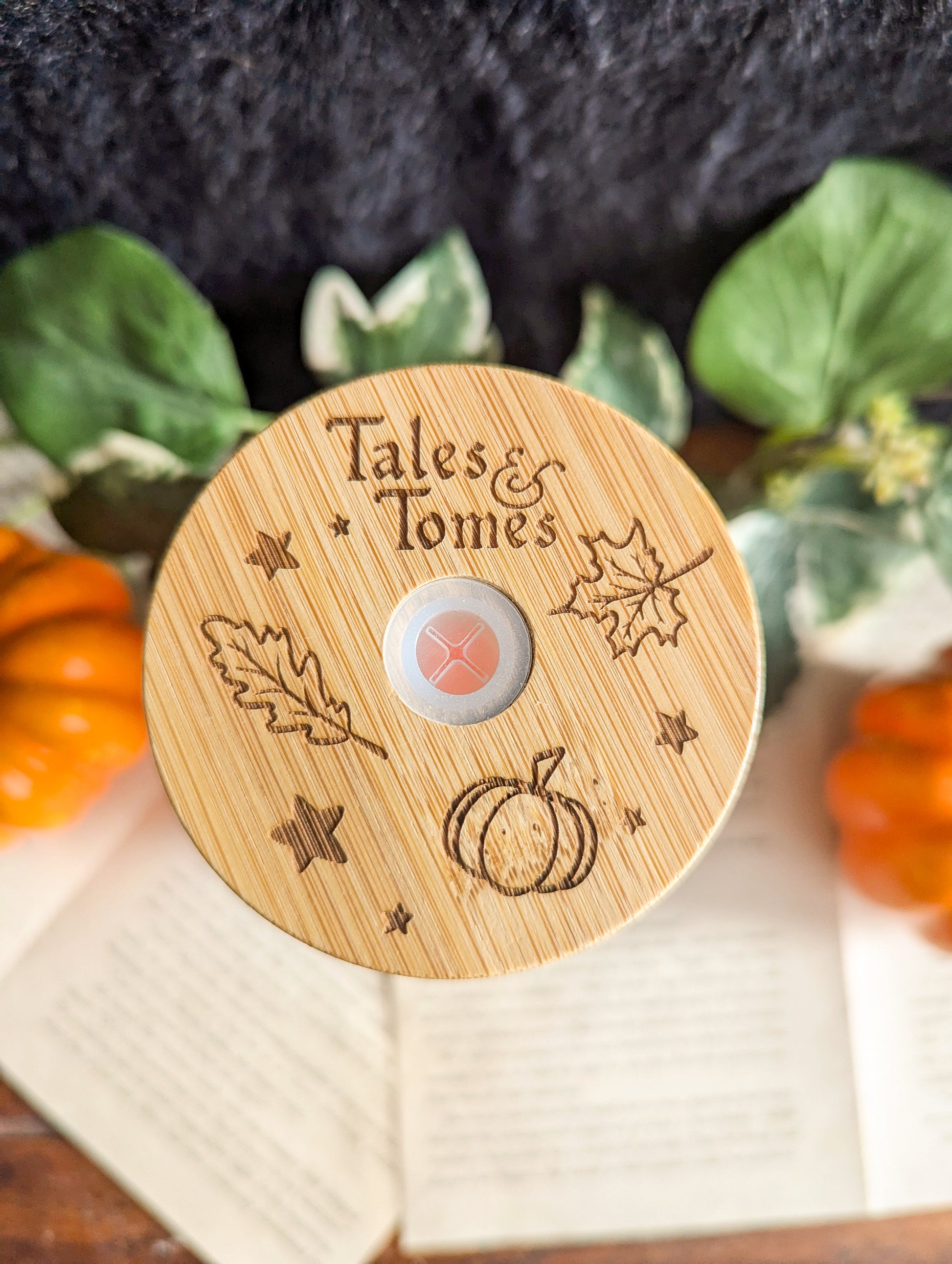 Spooky Dragon Reader Can Glass Cup with bamboo lid and straw. The perfect cup for your cold brews, sodas, juice and water for cosy autumnal reading sessions.