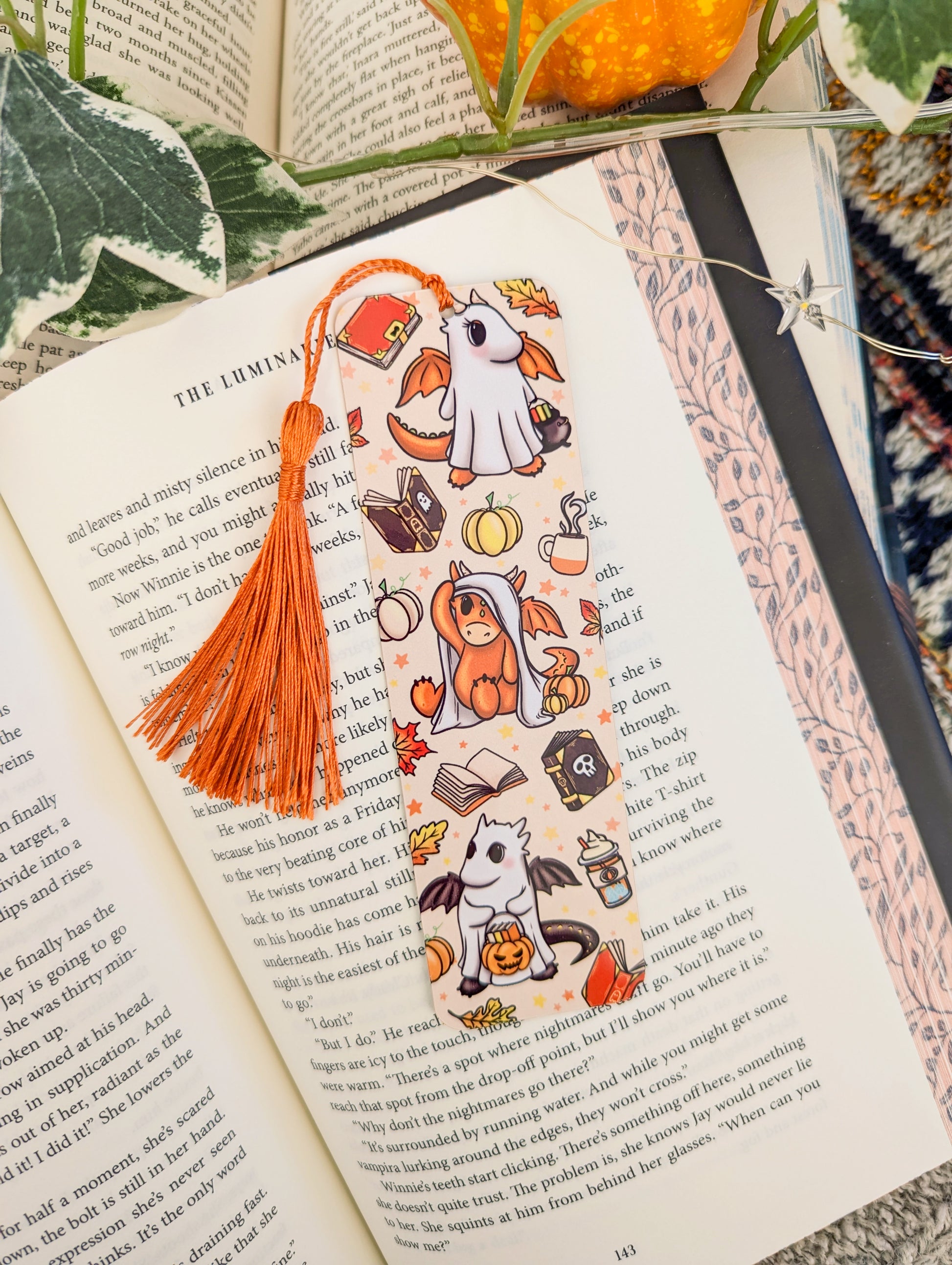Original Illustration printed on high quality 6” x 2” aluminium 0.5mm & finished with a matching tassel. Design features 3 cute baby dragons dressed as ghosts trick or treating for books, pumpkin spiced lattes, tomes, pumpkins, autumn leaves and stars. Please note the colour of the artwork/product can vary on each device screen.