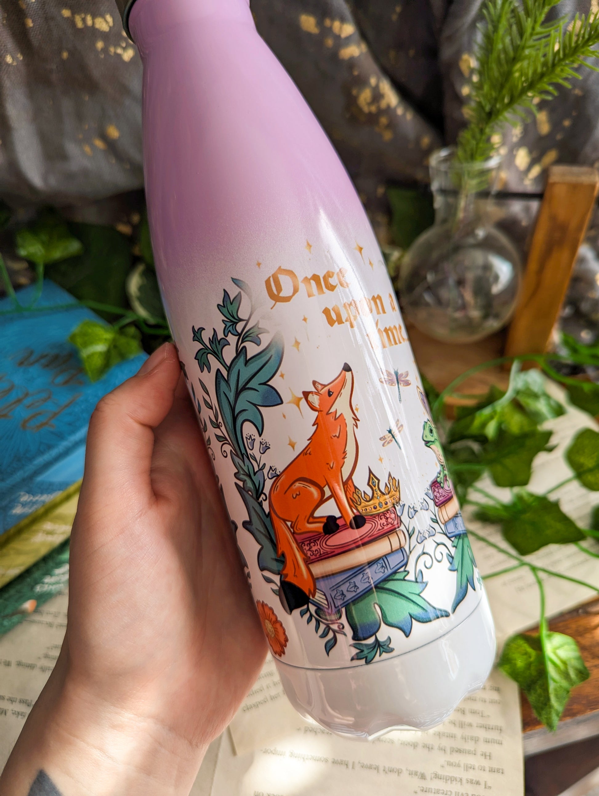 Unique gradient coloured bottle in white and purple (each bottle may look very slightly different than another because of the way this effect is created). Original design is sublimated on the bottle in my little home studio. Design features our Fox King and Fairy Frog characters atop book stacks and surrounded by whimsical flora and fauna.