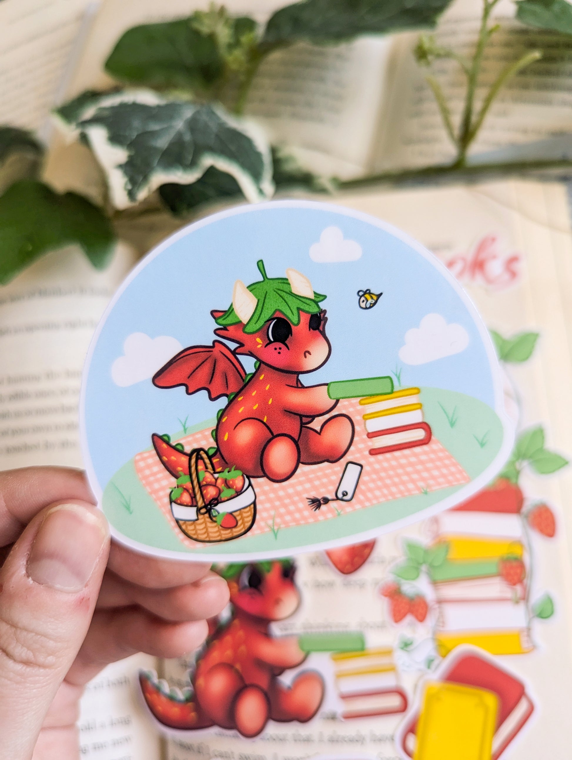 Strawberry Dragon Picnic vinyl sticker. The perfect bookish accessory to show your love of reading this summer. Stick on your laptop, water bottle, book cart…..literally anywhere you like, to add a touch of bookish beauty to your space.