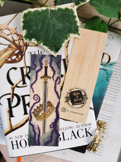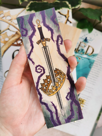 Single-sided woodmark featuring Nightfell, Jude Duate’s sword through the Cruel Prince Crown with purple thorns in the background.