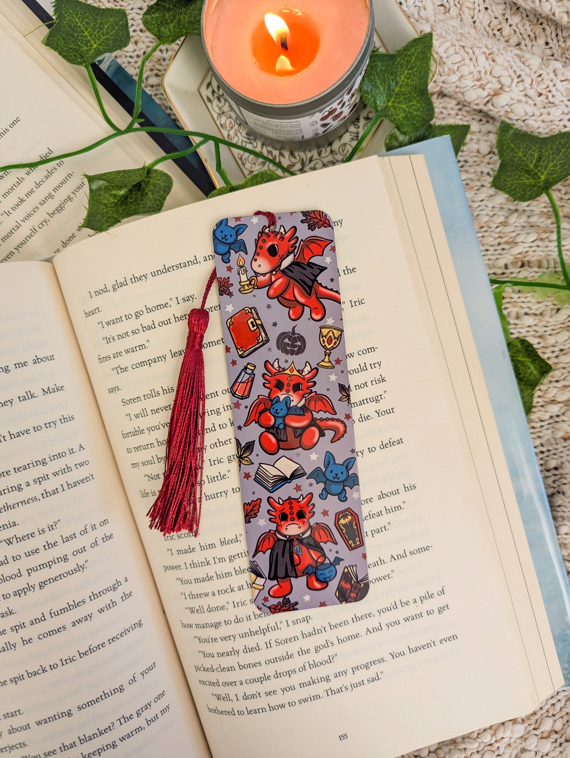 Original Illustration printed on high quality 6” x 2” aluminium 0.5mm & finished with a matching tassel. Design features 3 cute baby dragons dressed as ghosts trick or treating for books, pumpkin spiced lattes, tomes, pumpkins, autumn leaves and stars. Please note the colour of the artwork/product can vary on each device screen.