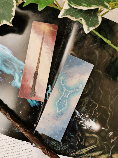 Double-sided woodmark featuring a wizard wand on one side & stag Patronus on the other in beautiful shades of blue and turquoise. Expecto Patronum!